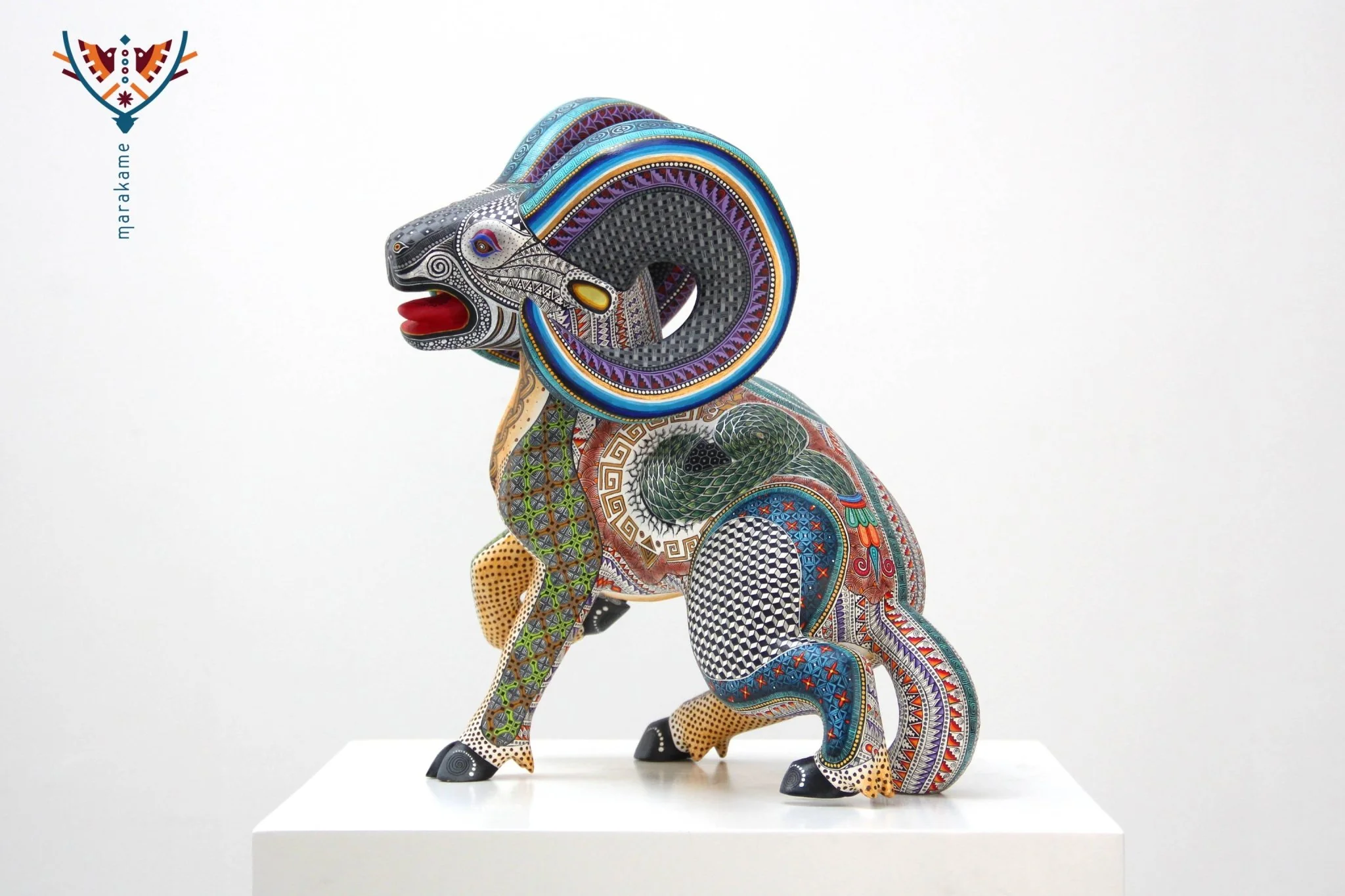 El Alebrije Borrego Cimarrón está pintado con un amplio espectro de colores naturales, desde tierra cocida hasta verdes, brillantes y azules claros. Los grandes cuernos azules del borrego están adornados con figuras geométricas blancas y negras, que reflejan la complejidad y riqueza de la cultura zapoteca.