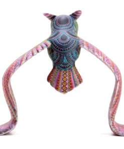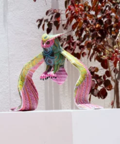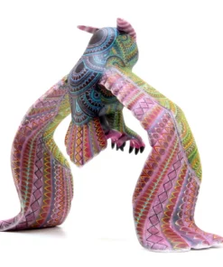 Los colores azul, verde y rosa crean un contraste interesante y vibran con energía, mientras que los círculos en el estómago del búho agregan un toque de simetría y armonía. Los detalles en pintura reflejan la rica cultura y mitología mexicana, invitan al espectador a explorar la magia y la sabiduría de este animal nocturno. El Alebrije – Búho Real es perfecto para aquellos que buscan un objeto decorativo que les permita conectarse con la naturaleza y la espiritualidad.