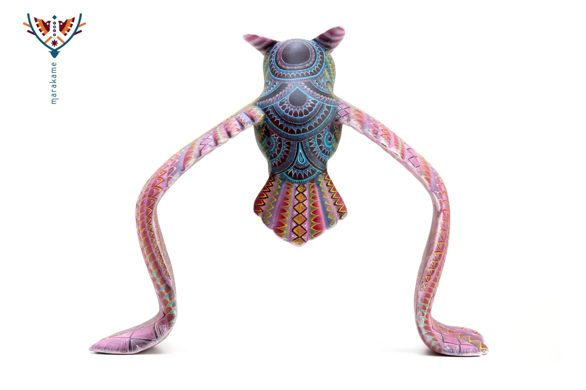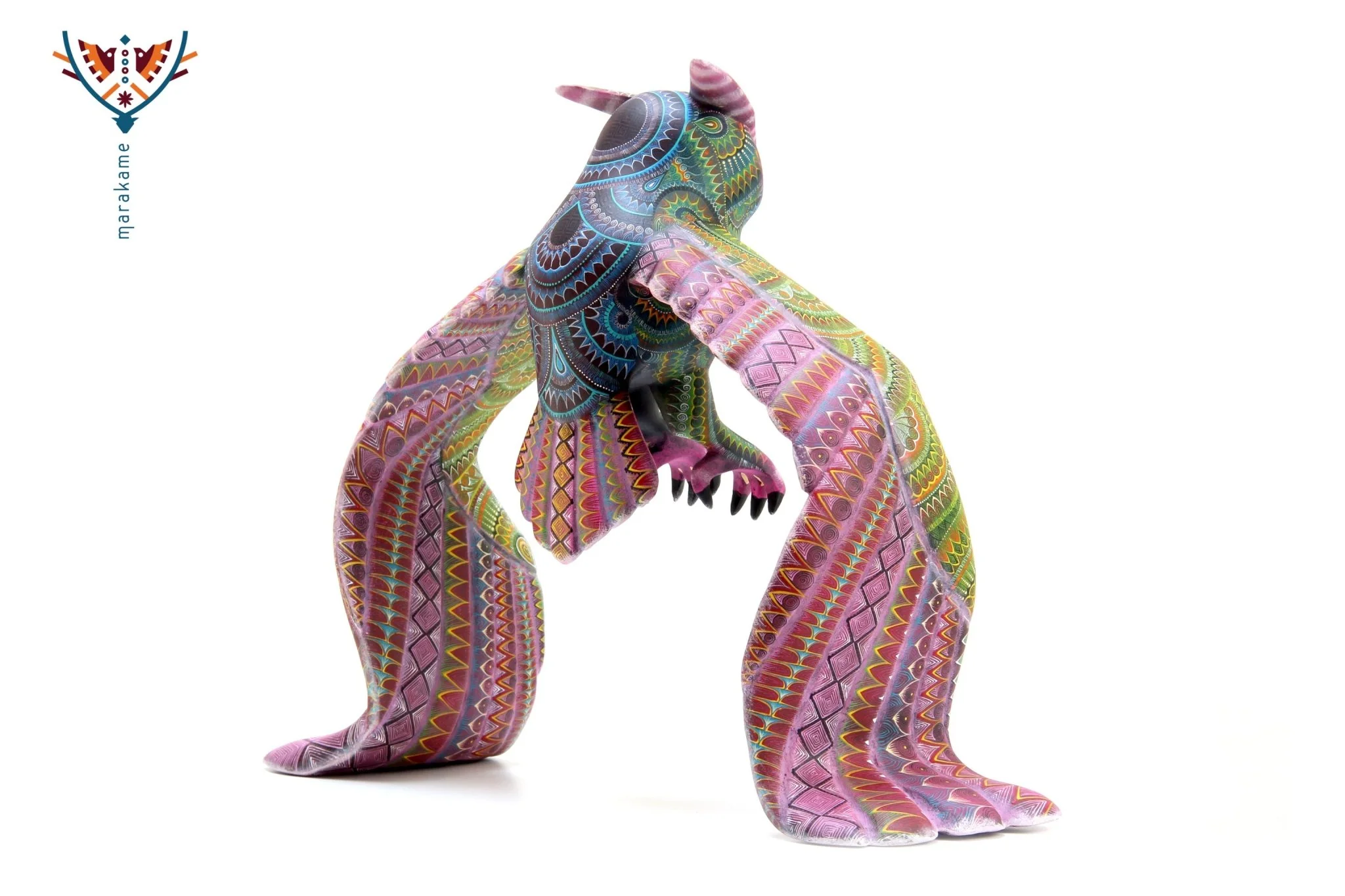 El Búho Real es un alebrije que invita a la contemplación y la serenidad. Esta figura nocturna se presenta con alas extendidas, como si estuviera en vuelo, pero en realidad está apoyada sobre el suelo. La madera de copal y la pintura a mano han sido combinadas para crear un efecto visual que evoca la noche estrellada.