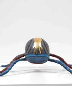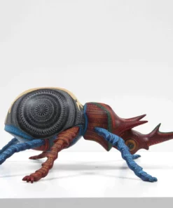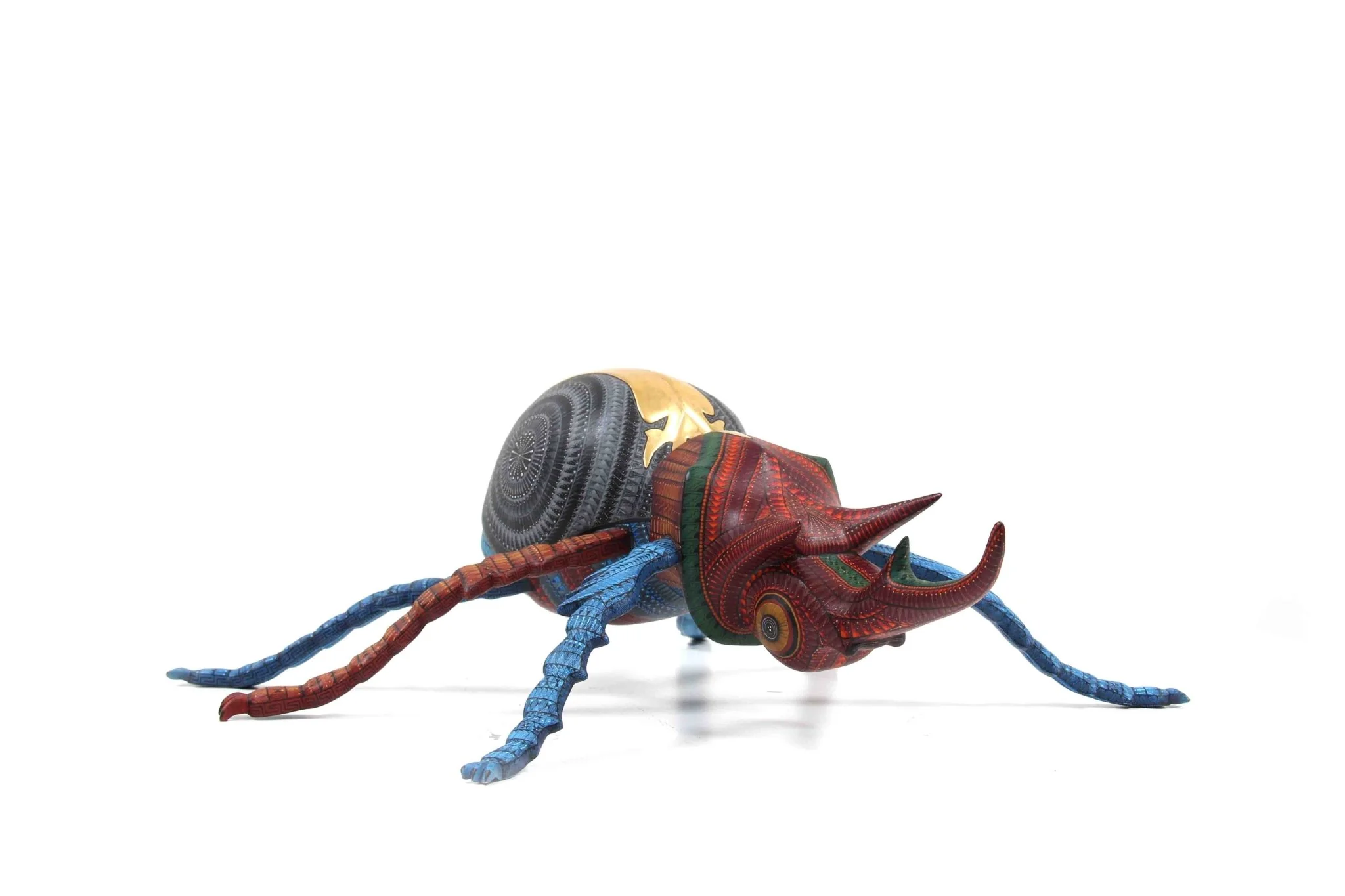 Las patas del escarabajo están decoradas con tonos azules y rojos, lo que crea un efecto visual interesante y dinámico. La parte baja del alebrije está diseñada con círculos grises y negros, lo que sugiere la conexión con la tierra y la noche. La característica más impresionante de este alebrije es la gran sección dorada en la parte inferior del cuerpo, que atrae la atención y destaca el diseño.