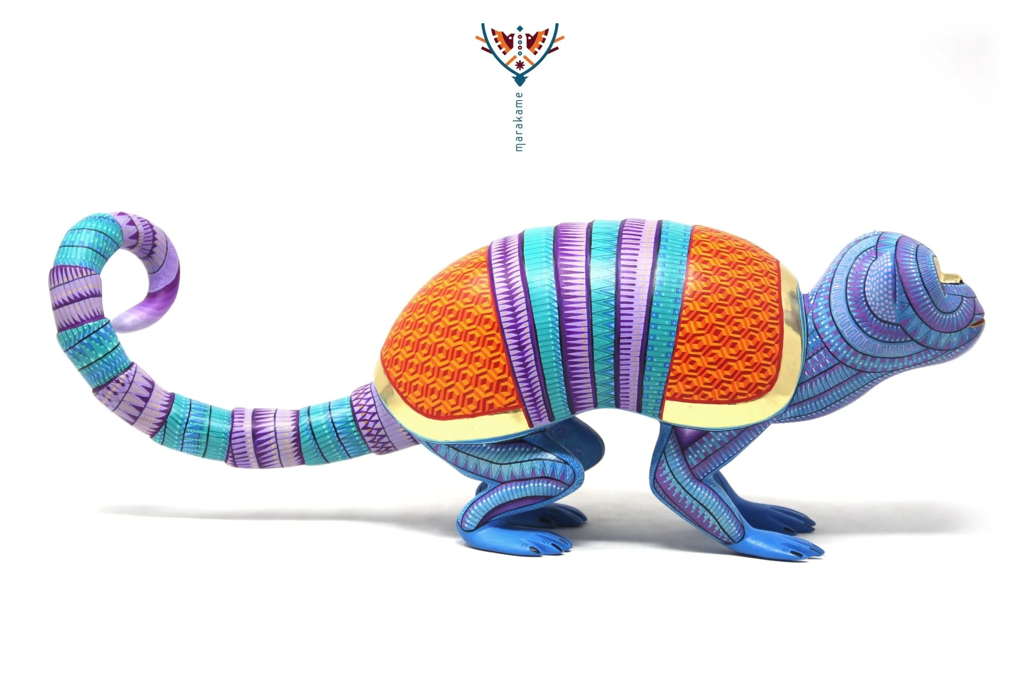 Un alebrije que fusiona la energía y la creatividad del arte oaxaqueño. El Simio Armadillo es un objeto decorativo impresionante que combina la frescura de los azules con el calor de los morados y naranjas, creando un efecto visual vibrante y emocionante. Los detalles en pintura reflejan una pasión por la creatividad y la imaginación, mientras que el material dorado reflejante en los ojos y el contorno del caparazón añaden un toque de lujo y elegancia.