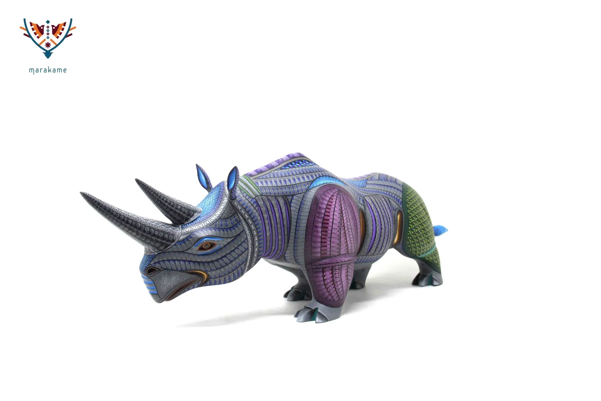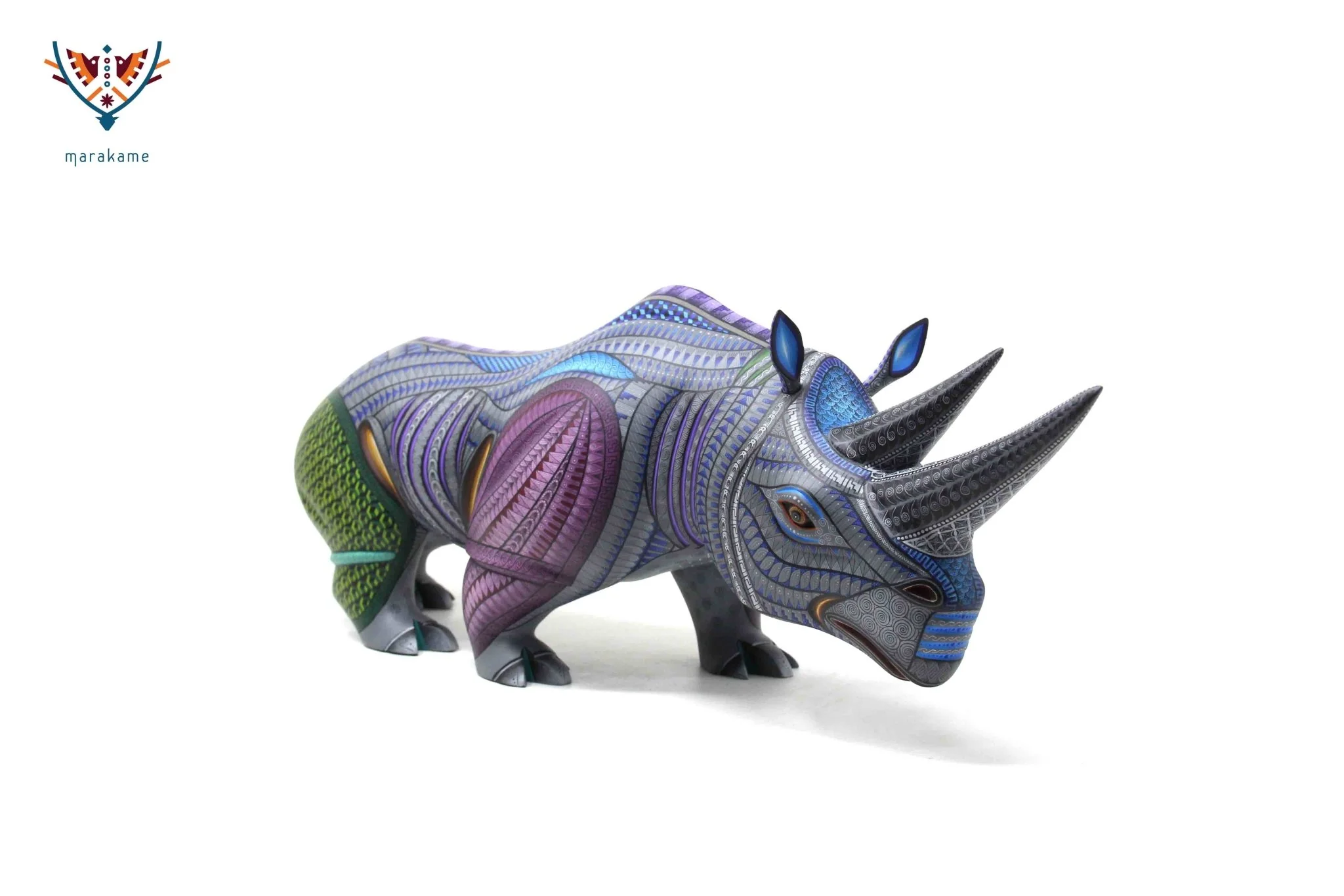 El estómago del rinoceronte está decorado con cortes de color amarillo y negro, lo que crea un efecto visual interesante y dinámico. Los símbolos azules se reparten por todo el cuerpo del alebrije, lo que sugiere una conexión profunda con la espiritualidad y la conexión con la naturaleza. Los cuernos grises del rinoceronte son una característica única y fascinante de esta pieza. La madera blanca y lisa del alebrije es perfecta para adornar cualquier habitación de tu hogar.