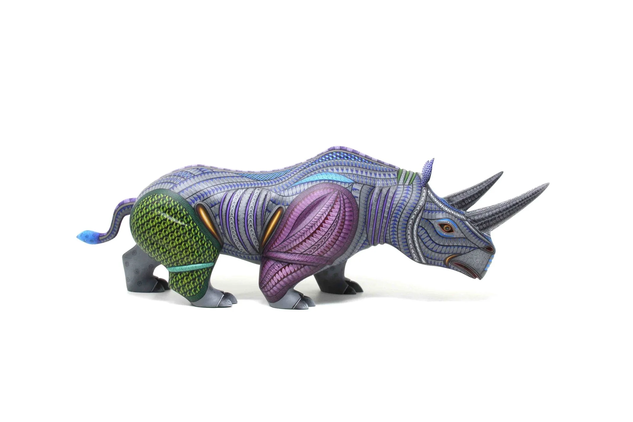 Los colores fríos predominan en esta pieza, con tonos azules que recorren todo el cuerpo del rinoceronte. Las patas traseras, verdes y moradas de las delanteras son un toque especial que agrega contrastes interesantes al diseño.