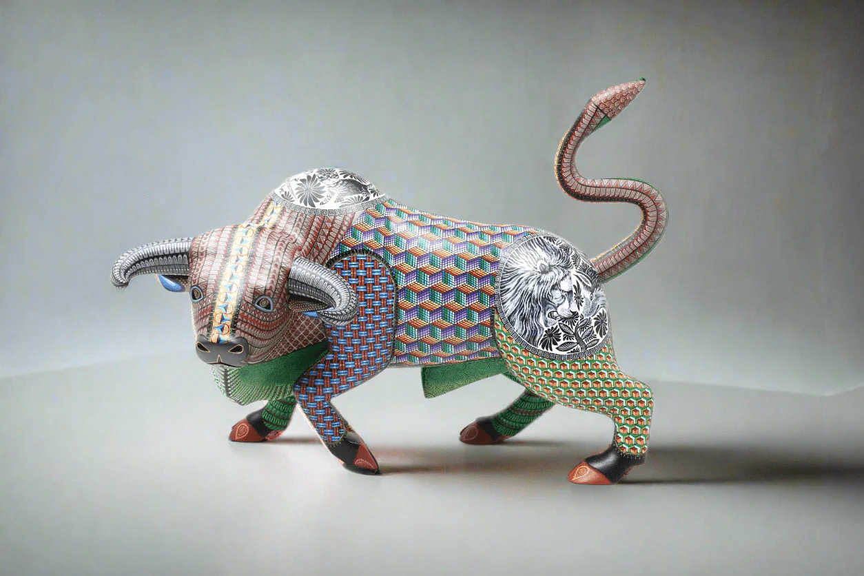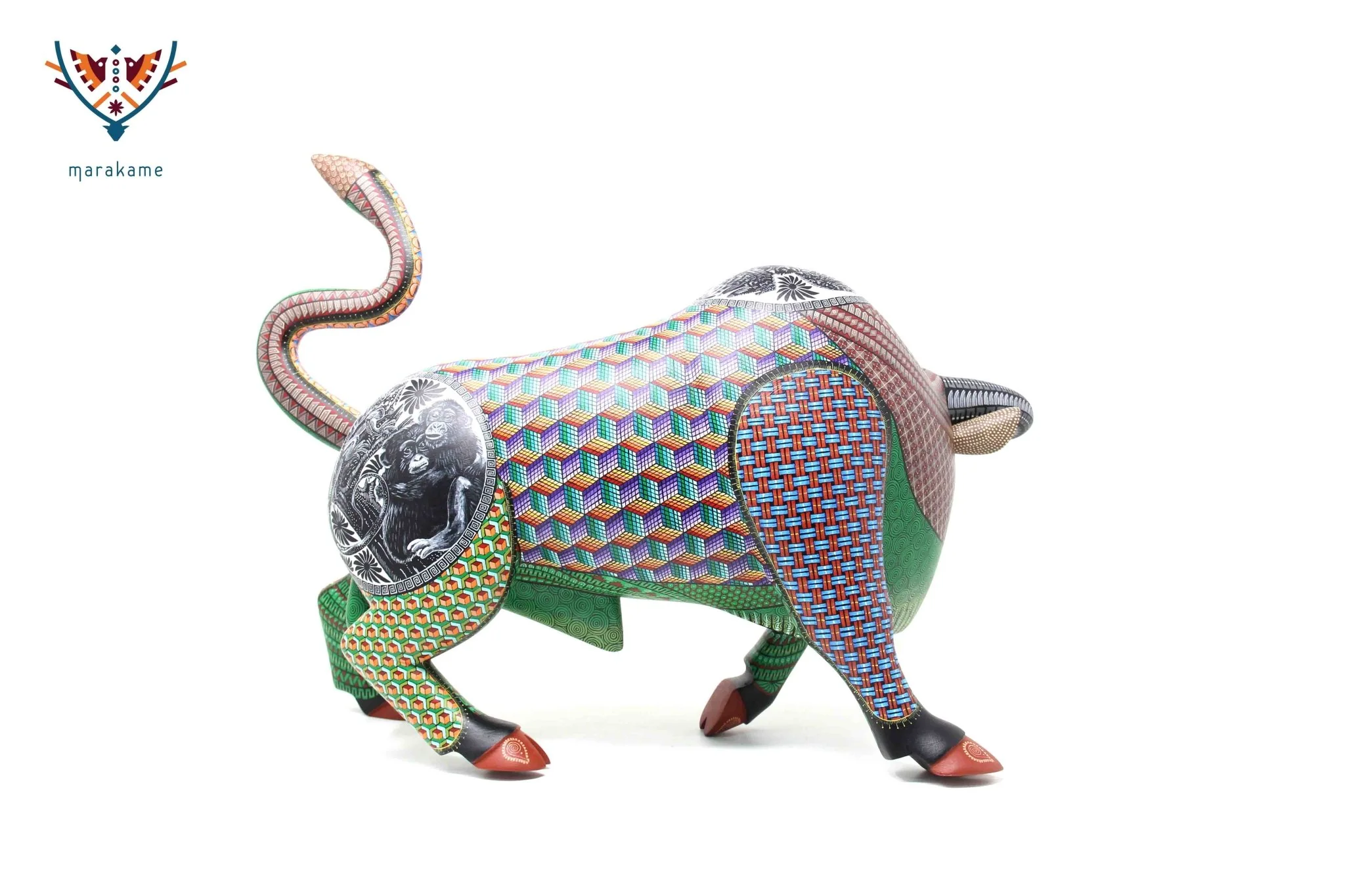 Una pieza artística que combina la tradición de los alebrijes mexicanos con el simbolismo zapoteca. El alebrije se encuentra en pose dinámica, como si estuviera saltando o corriendo. La madera utilizada para este alebrije tiene una gran textura, lo que le da una apariencia rugosa y natural. Los círculos blanco y negro que rodean el cuerpo del toro crean un efecto visual interesante y dinámico, como si estuvieran en movimiento.