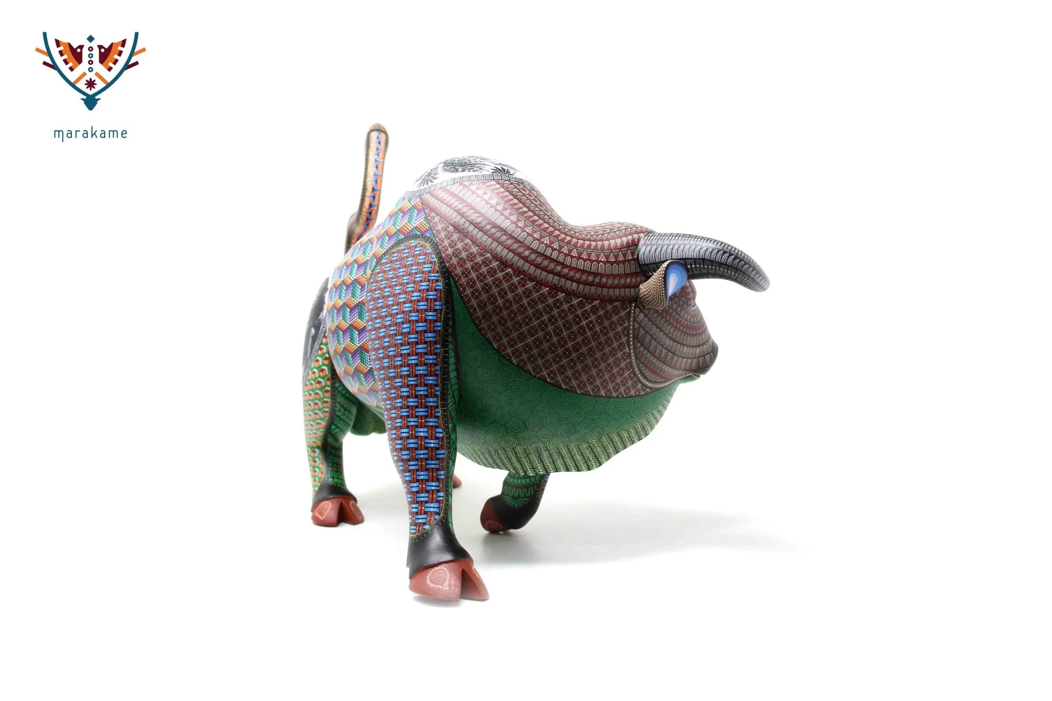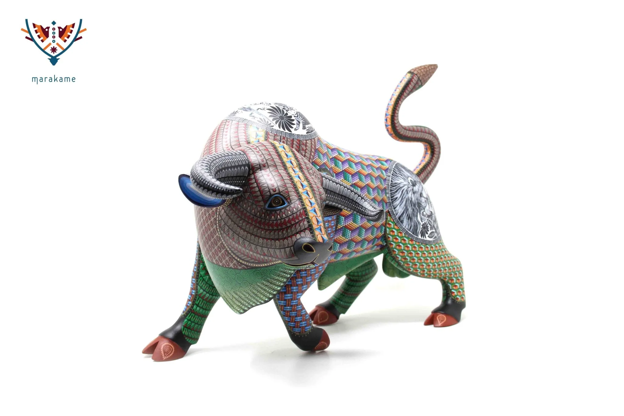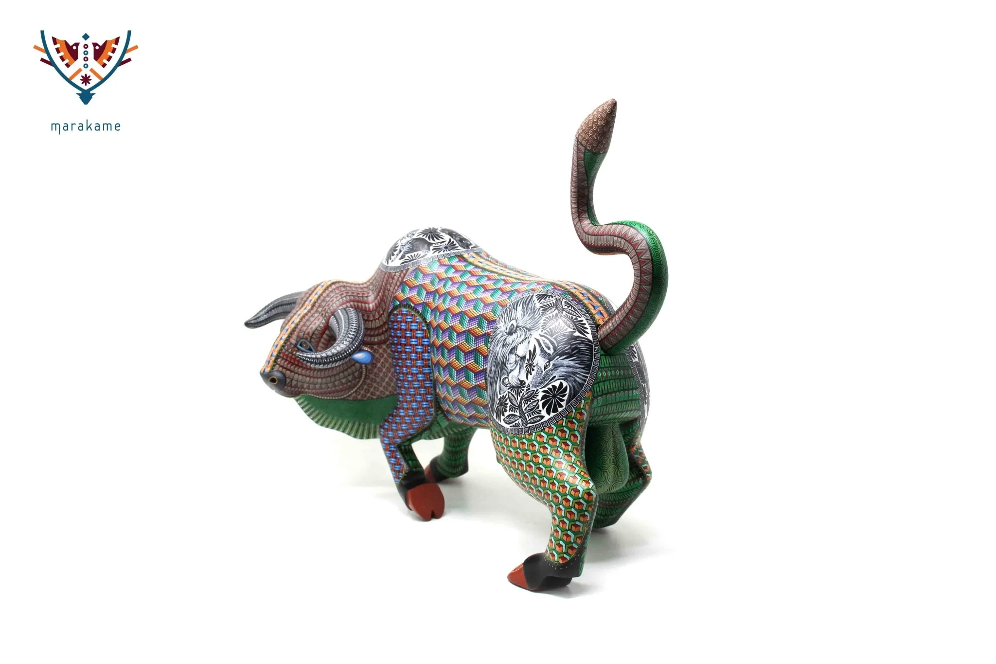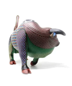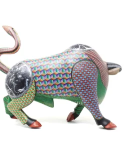 El cuero de la cabeza del toro está decorado con muchos colores, lo que crea una sensación de energía y vitalidad. Los colores utilizados son vivos y vibrantes, lo que hace que la pieza sea aún más emocionante. Los cuernos blanco y negro del toro están diseñados para parecerse a dos grandes rayas que salen de su cabeza, lo que agrega un toque de poder y autoridad. La pose dinámica de este alebrije es perfecta para aquellos que buscan una decoración emocionante y fascinante. La textura y los colores utilizados en esta pieza hacen que sea ideal para aquellos que aprecian el arte mexicano y la cultura zapoteca.