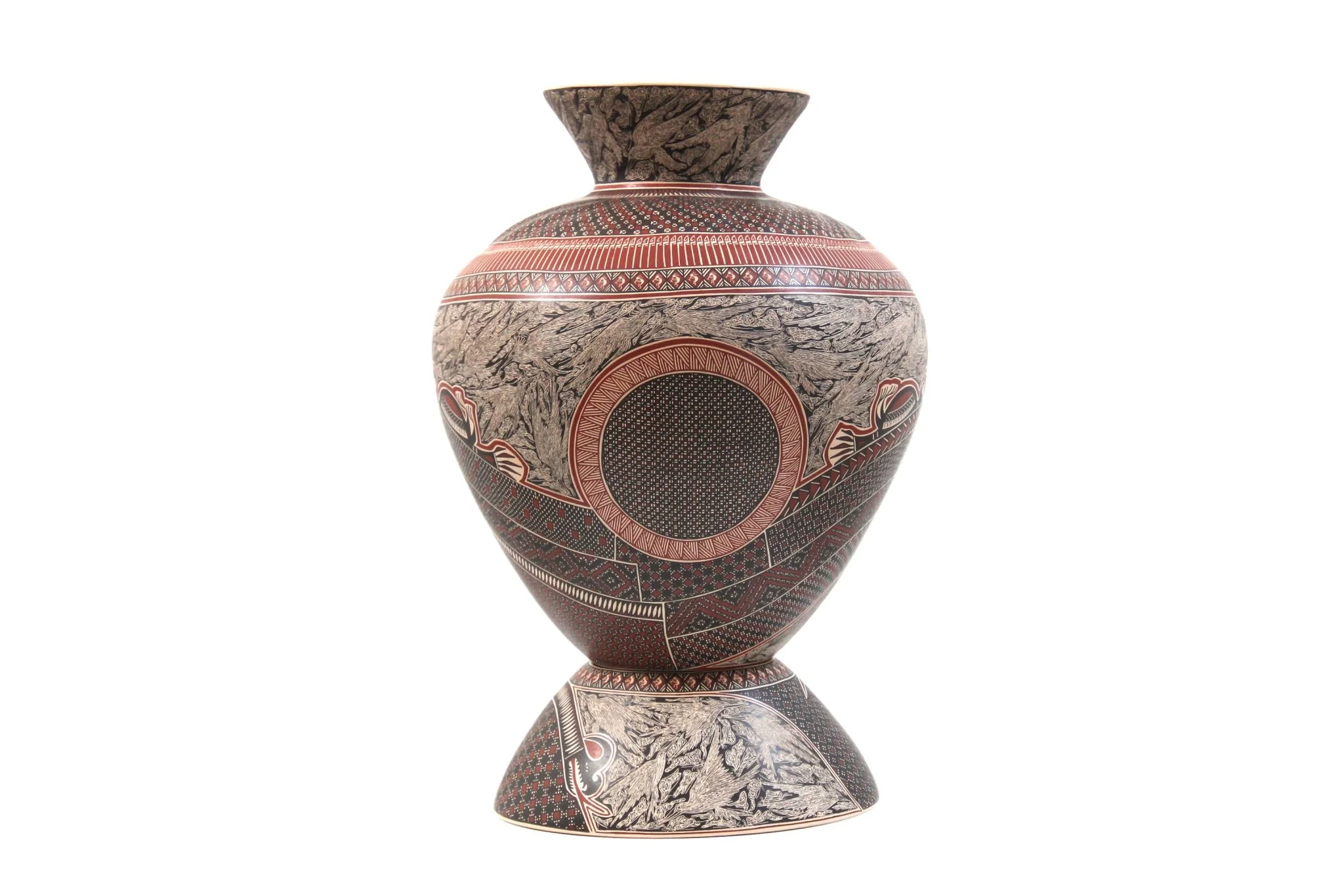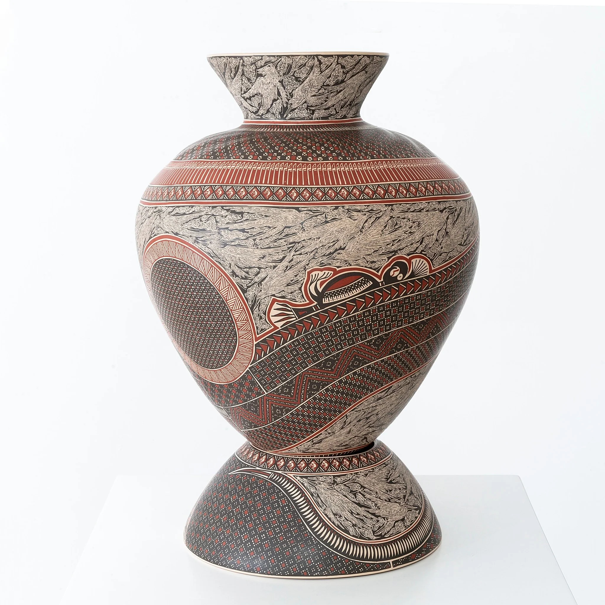 La escala grande de la pieza permite apreciar los detalles de los pajaros y la serpiente de manera aún más detallada, creando un efecto visual que es difícil de olvidar. Esta obra de arte cerámica es un verdadero tesoro para cualquier coleccionista, una pieza única y especial que puede ser disfrutada por aquellos que aprecian el arte y la cerámica.