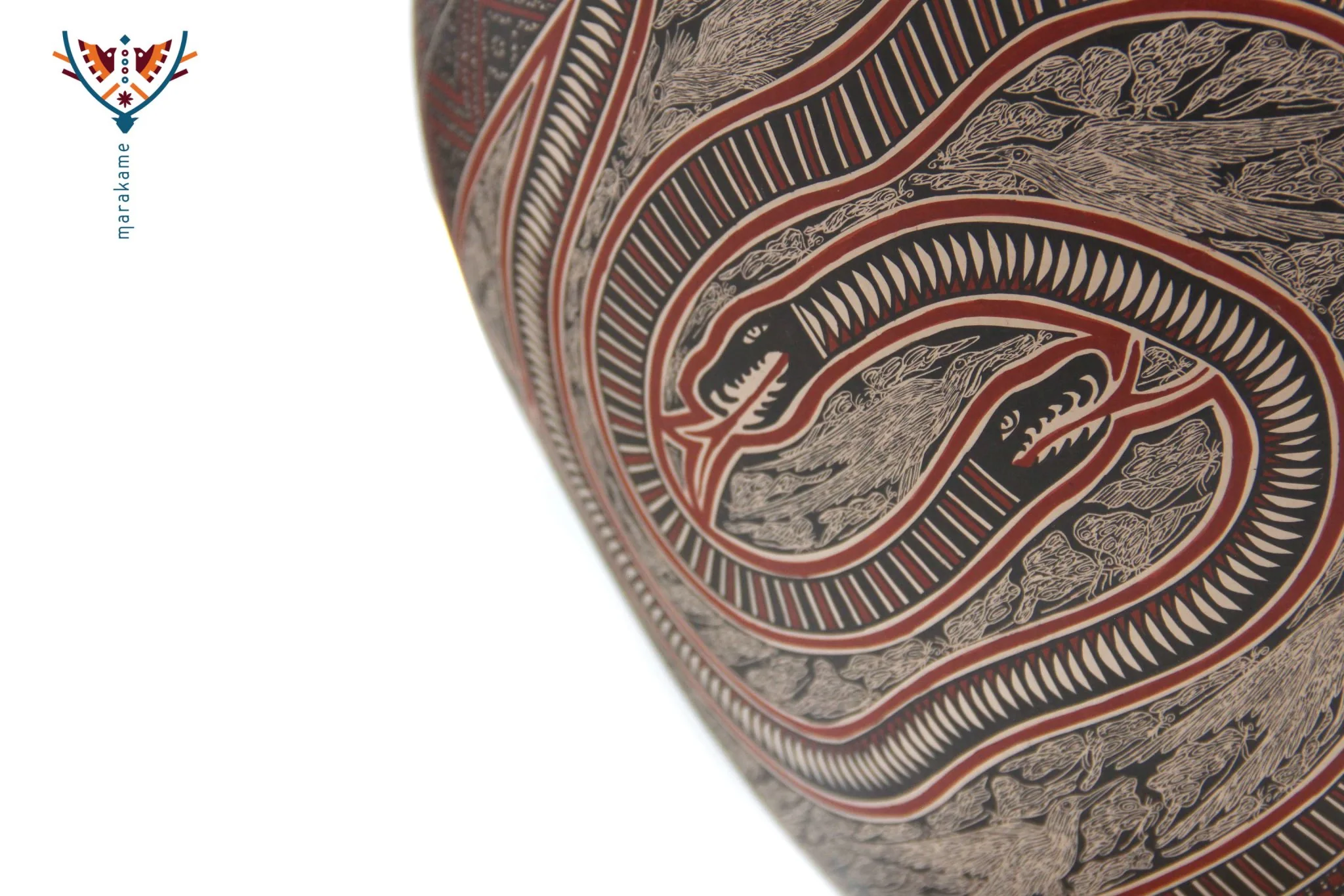 La pieza está llena de detalles intrincados, con multitud de pajaros en diferentes posiciones y estilos, creando un efecto visual rico y vivo. Unas serpientes curvadas se entrelazan entre los pajaros, agregando un toque adicional de drama y complejidad al diseño.