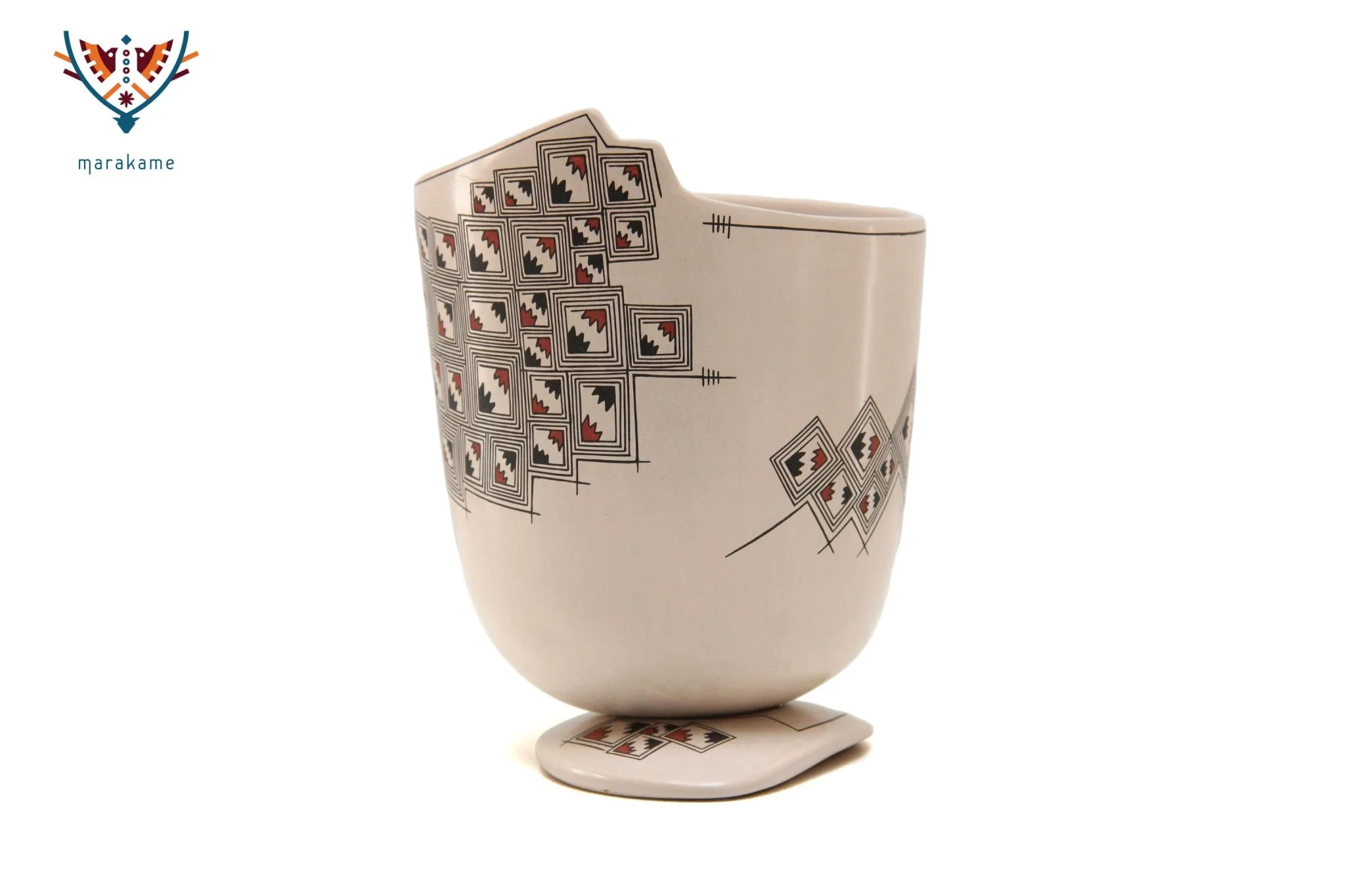 Esta hermosa pieza de cerámica es un objeto de arte decorativo que invita a la contemplación y el disfrute. La forma clásica y elegante está decorada con detalles pintados de cuadros, creando un patrón visual interesante y complejo.