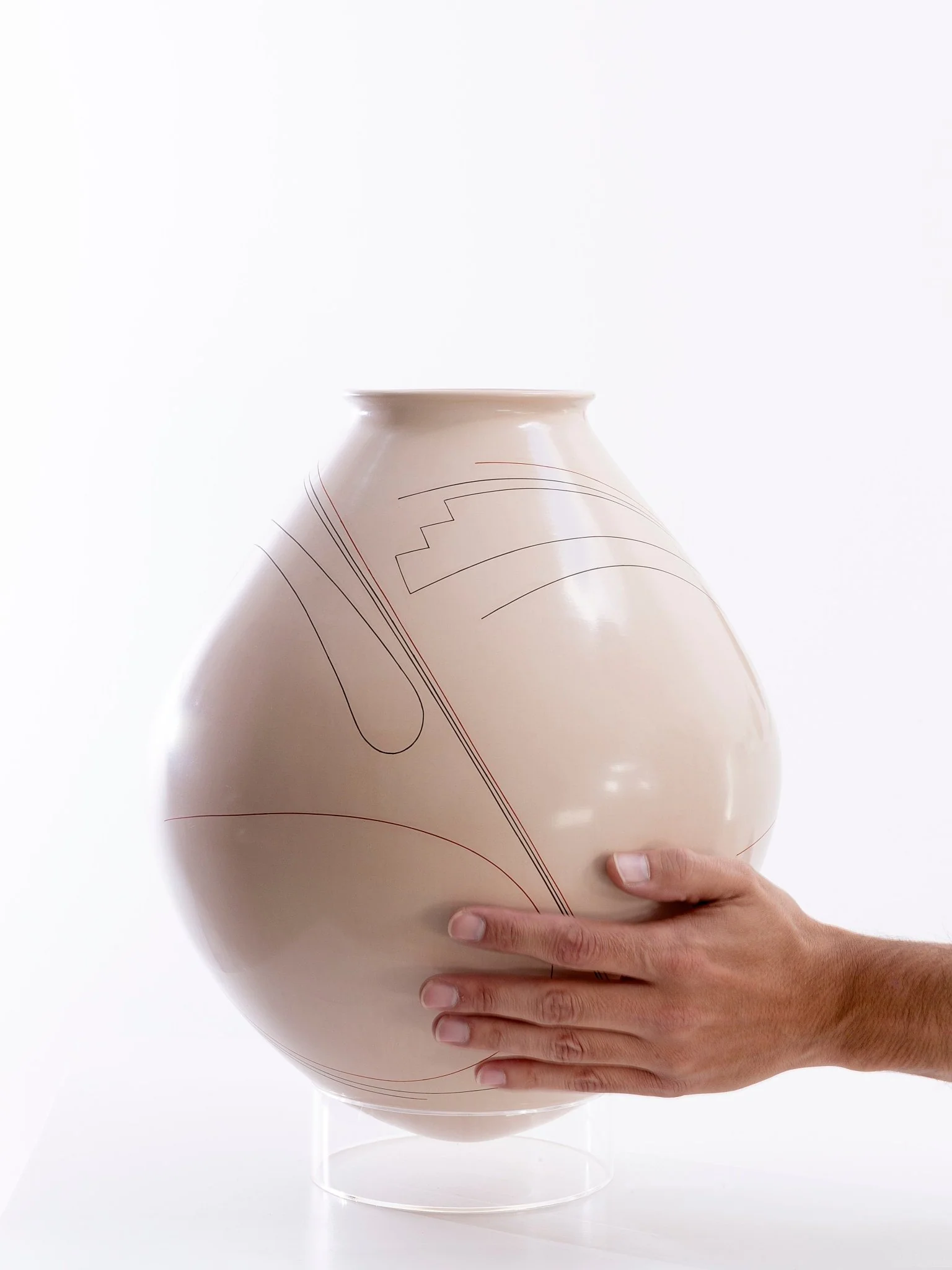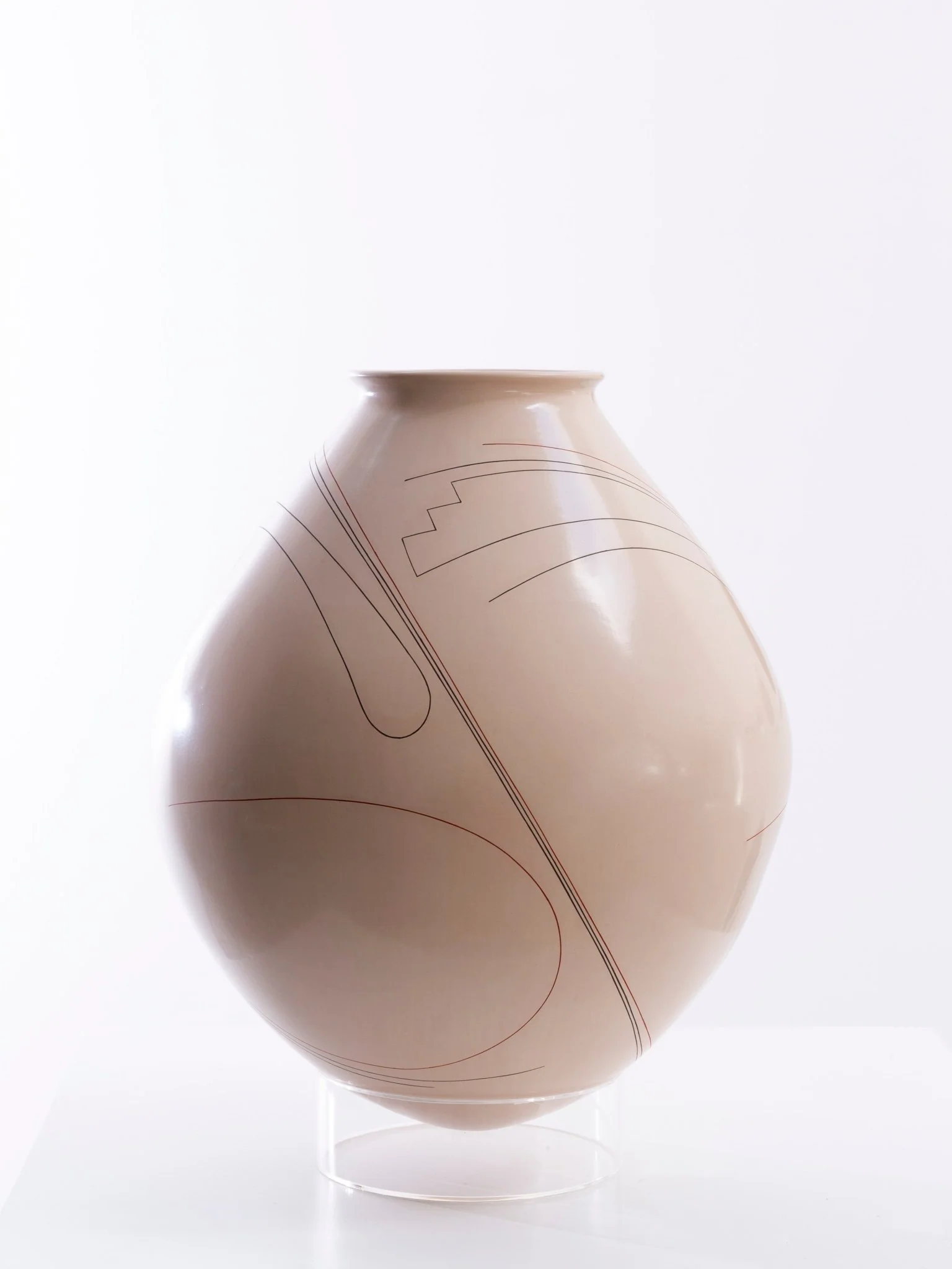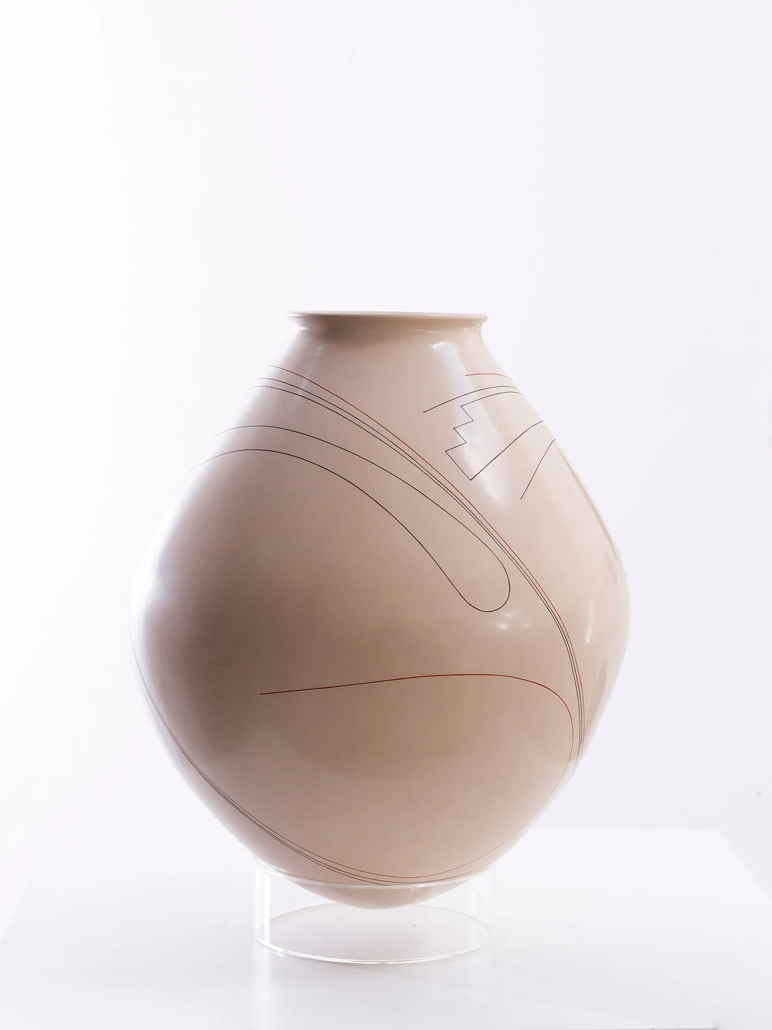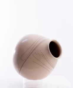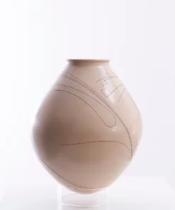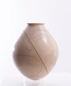 Las líneas curvas y ondulantes parecen flotar sobre la pieza, invocando el viento, el agua o la vida misma. La textura suave y las tonalidades cálidas del vidrio crean un contraste interesante con las líneas finas y negras, que se destacan como un dibujo en relieve. La cerámica es perfecta para aquellos que buscan una obra de arte contemporánea y única.