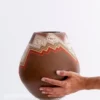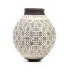 Esta hermosa pieza de cerámica presenta un diseño único y dinámico, gracias a las delicadas líneas que la cubren. Confeccionada en barro blanco vidriado, la cerámica muestra una serie de detalles finos y delgados pintados sobre la superficie, creando un efecto de movimiento y energía.