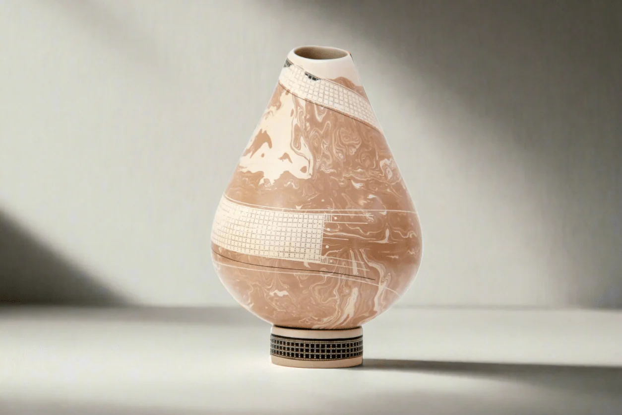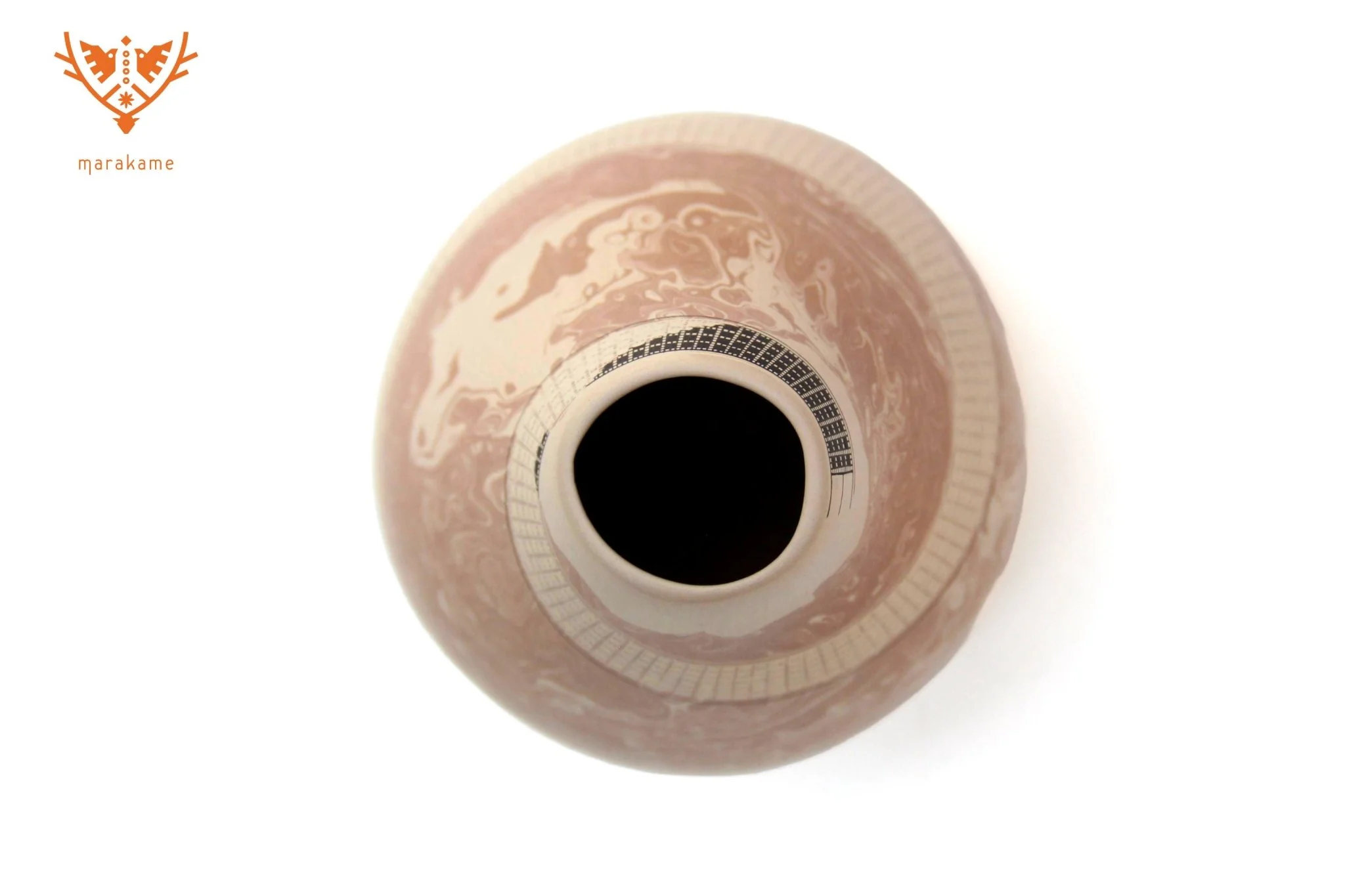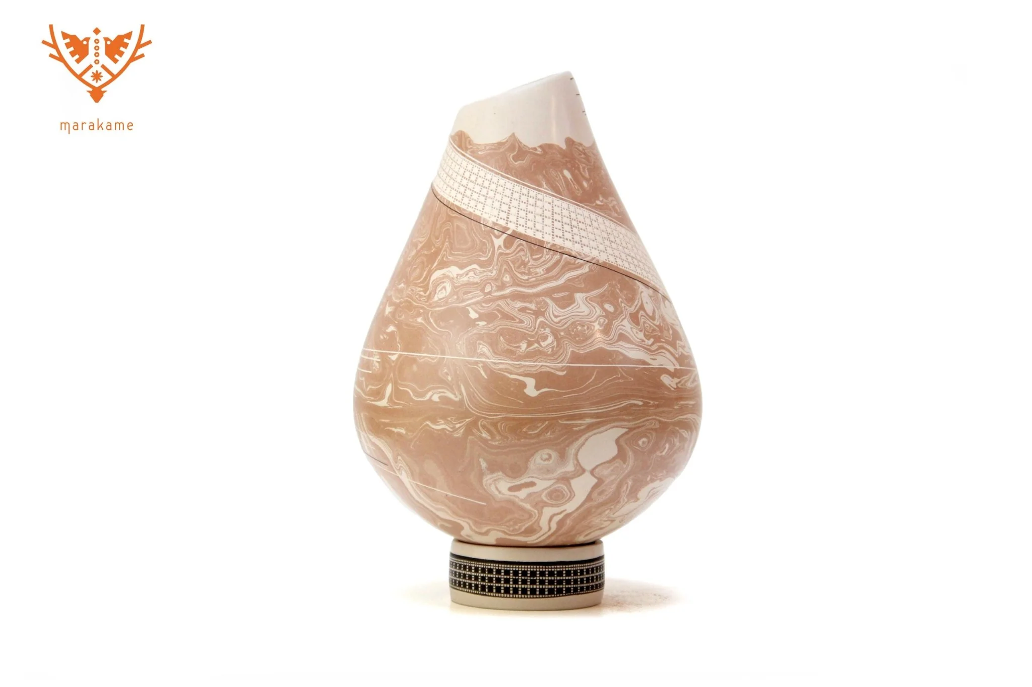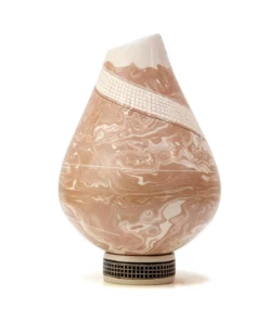 Esta impresionante pieza de cerámica presenta un diseño único y llamativo, con un tono naranja sobrio que invita a la contemplación. La textura de la cerámica es lo más destacado de esta pieza, ya que parece como si líquidos estuvieran mezclándose en una compleja danza visual.