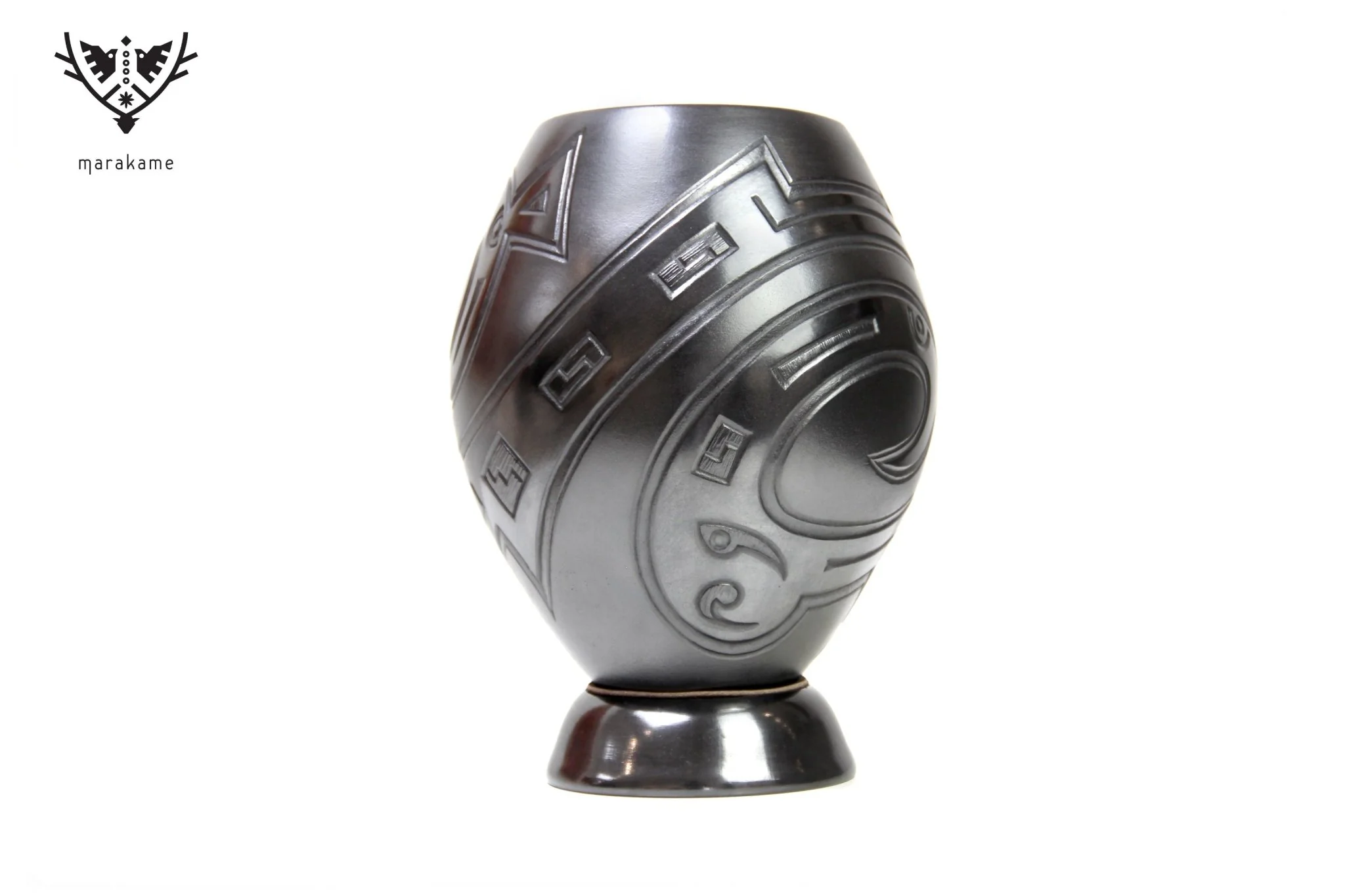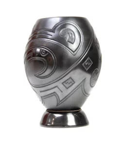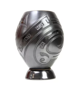 Esta hermosa pieza de cerámica presenta un contraste interesante con su superficie negra, que se destaca aún más gracias a la textura suave y los detalles finos que la adornan. La cerámica está hecha de barro negro vidriado, lo que le da un toque oscuro y profundo. Las líneas curvas y ondulantes que la cubren crean un efecto visual interesante, invocando el movimiento y la energía.