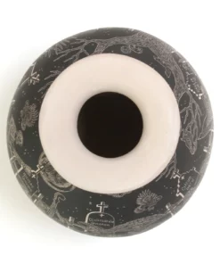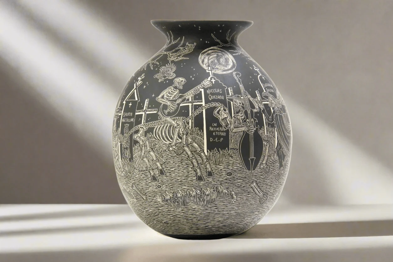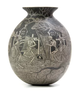Esta hermosa pieza de cerámica es un homenaje a la tradición mexicana del Día de Muertos. Presenta una escena viva y animada, donde Catrines y Calaveras bailan y tocan música en un entorno rodeado de flores y otros símbolos tradicionales.