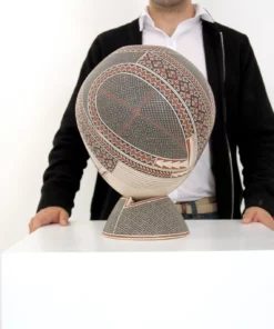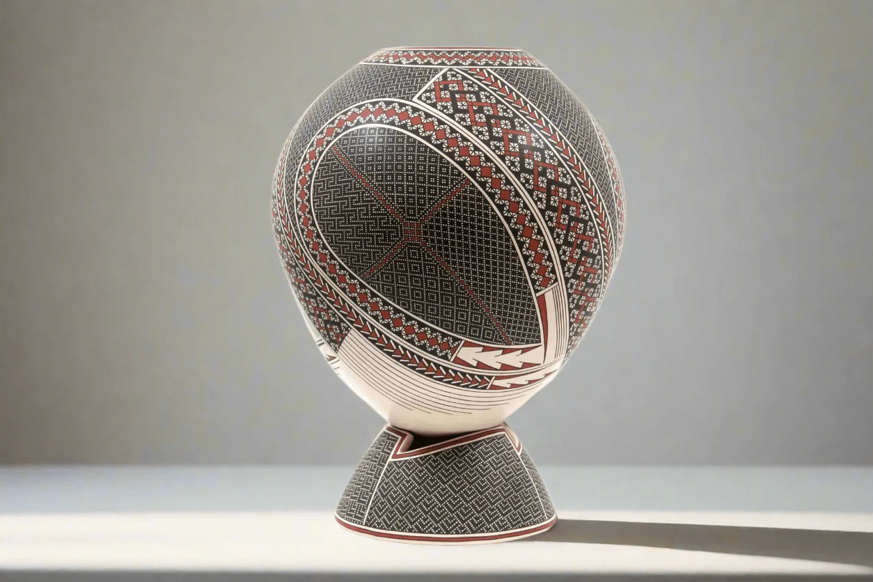 La escala grande de la pieza permite apreciar los detalles geométricos y los complementos en rojo de manera aún más detallada, creando un efecto visual que es difícil de olvidar. Esta obra de arte cerámica es un verdadero tesoro para cualquier coleccionista, una pieza única y especial que puede ser disfrutada por aquellos que aprecian el arte y la cerámica.
