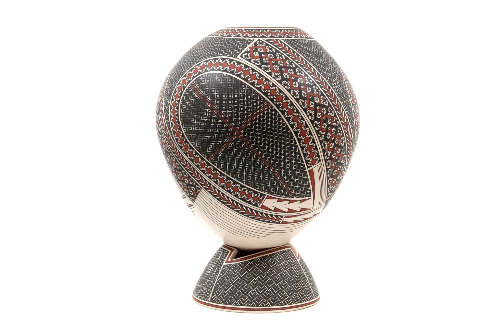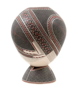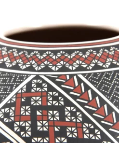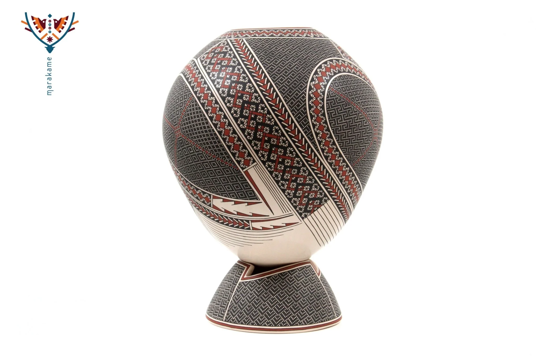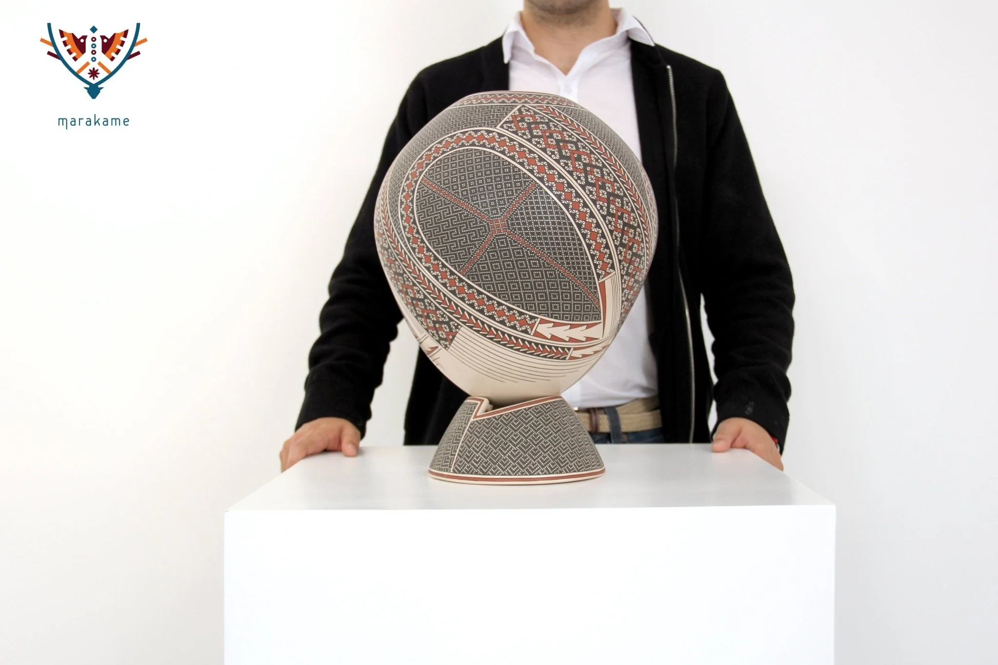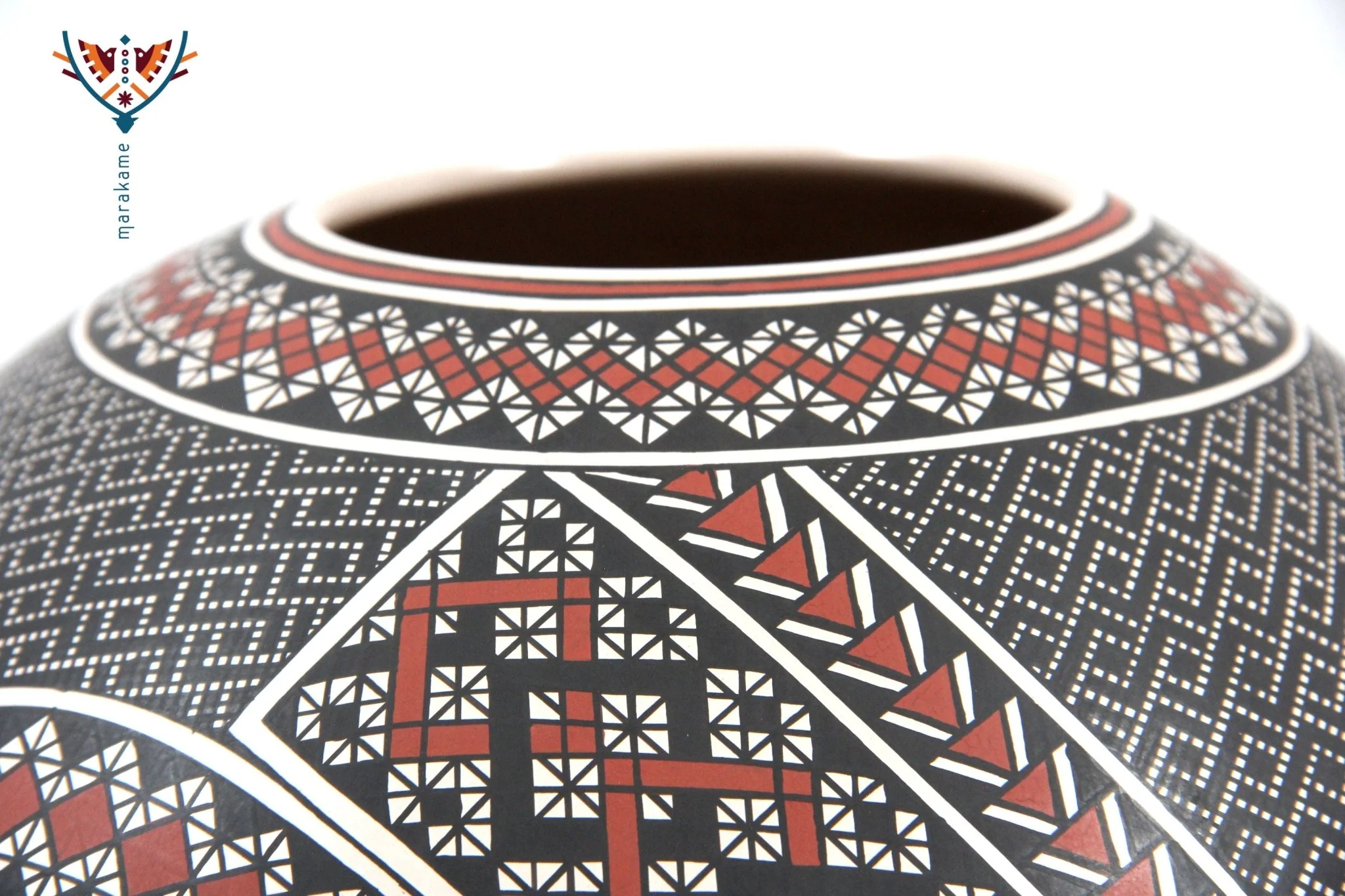 Un verdadero trabajo de arte, esta cerámica grande destaca por sus detalles geométricos en negro que se combinan con complementos rojos en un diseño que es a la vez rico y equilibrado. La cerámica grande presenta detalles geométricos en negro que cubren su superficie, creando un efecto visual rico y texturizado.