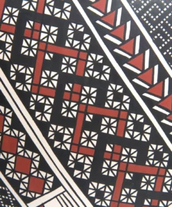 Los complementos en rojo añaden un toque de color y energía al diseño, creando un contraste interesante con los detalles negros. Los patrones geométricos se combinan para crear una pieza que es a la vez compleja y equilibrada.
