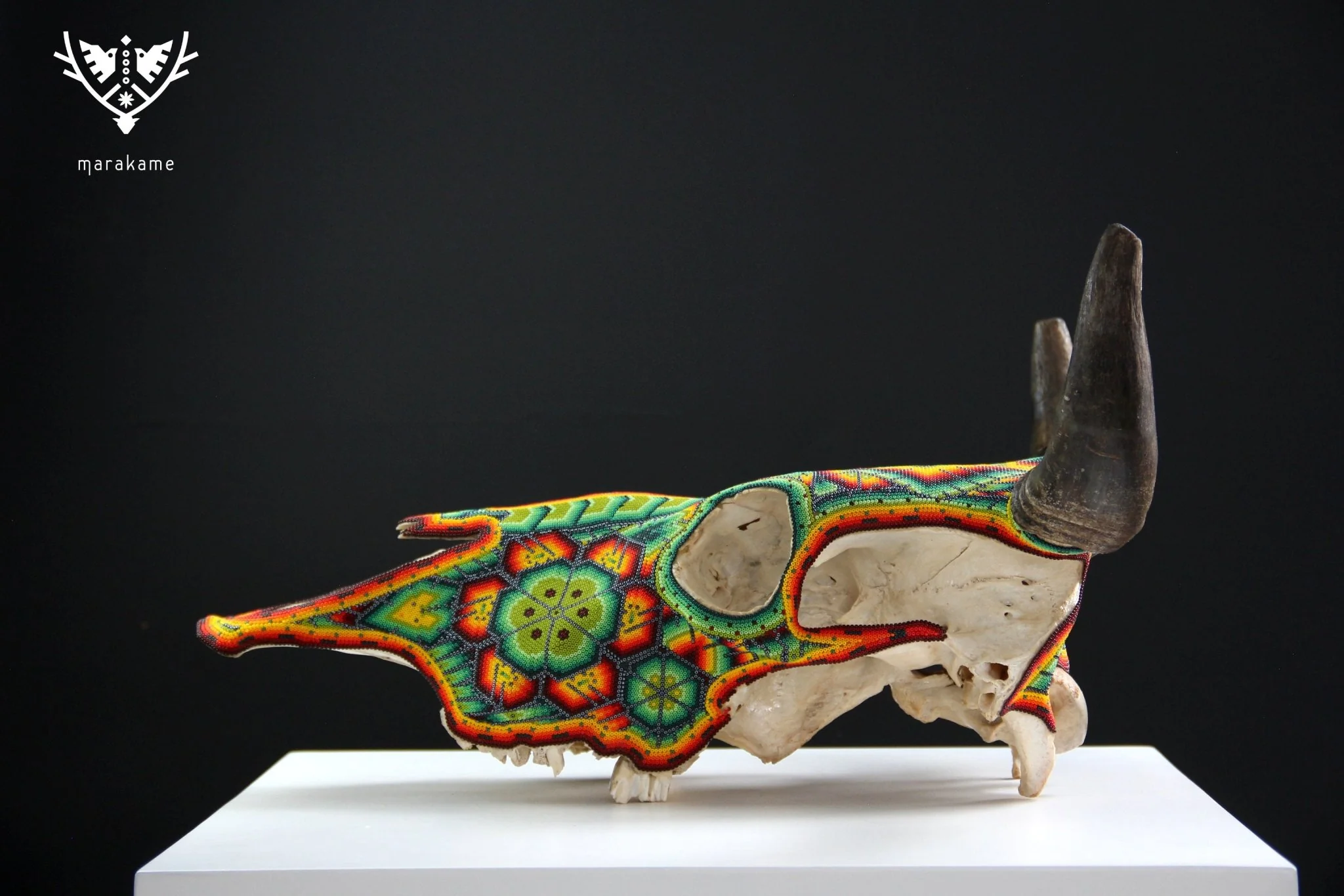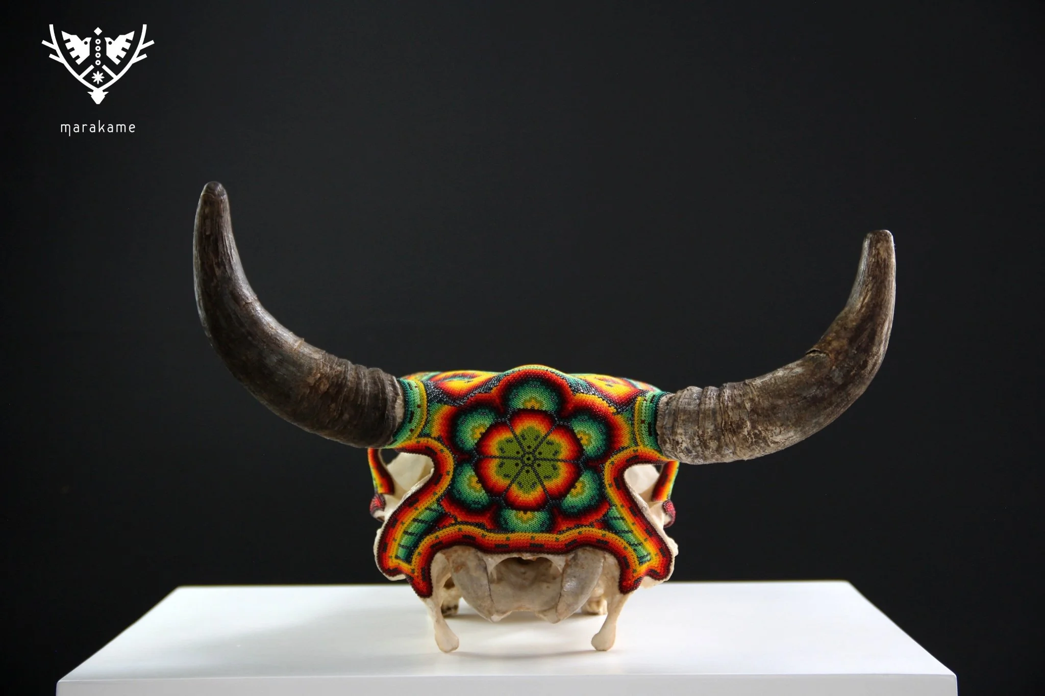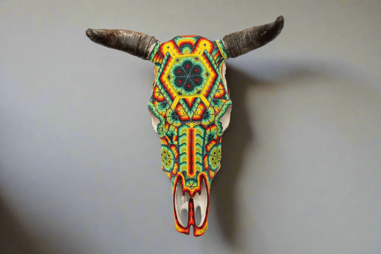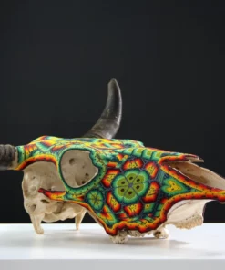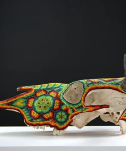 – El cráneo ha sido fumigado y barnizado para su exportación en caso de ser requerida.Piezas como los cráneos de ganado son producto de alguna celebración tradicional Wixárika -Huichol- y son posibles gracias al pegado de más de 33 mil chaquiras de cristal calibrado, una a una por las manos de los artistas Wixáritari. Cada pieza es única e irrepetible.
