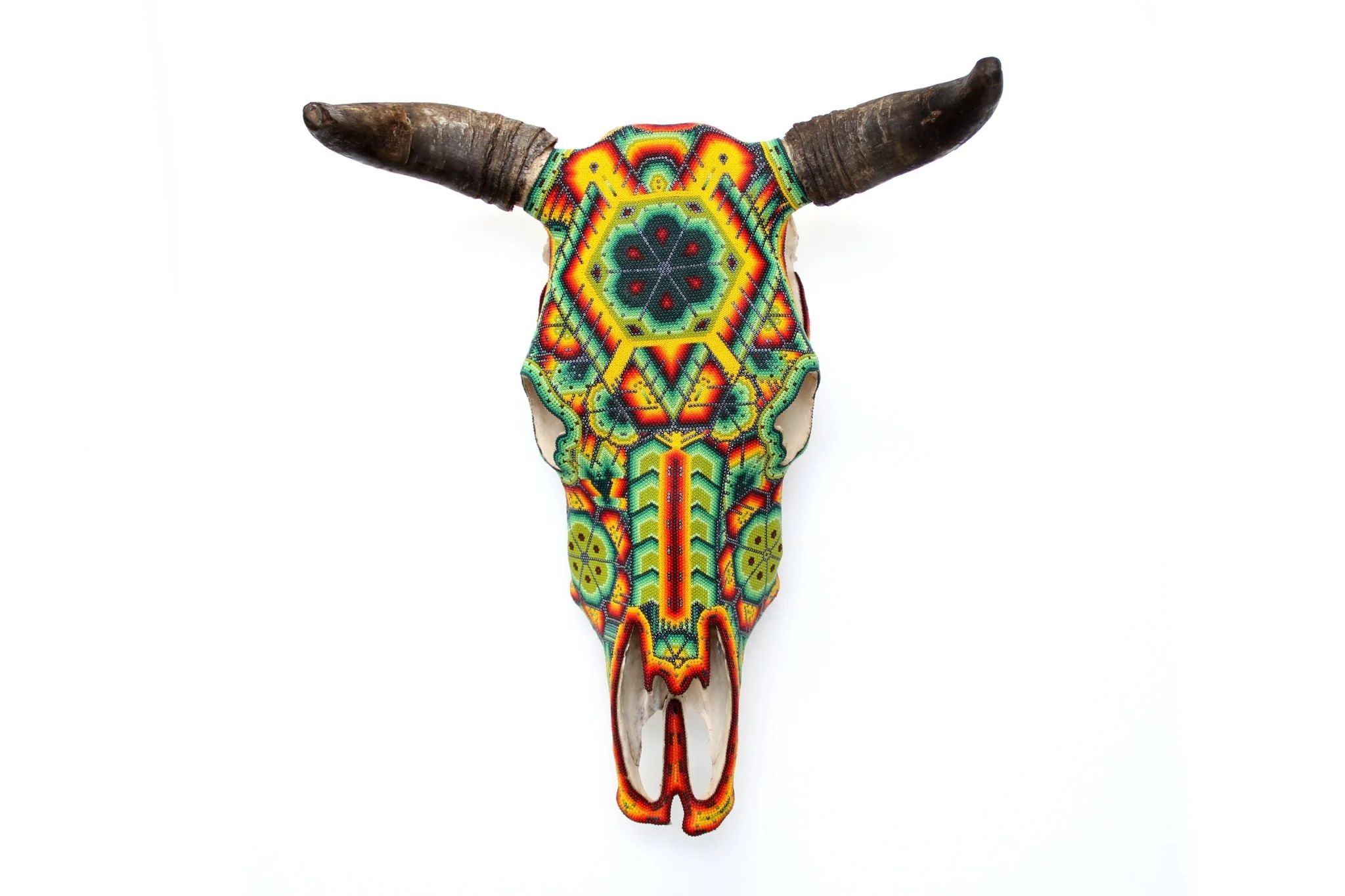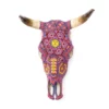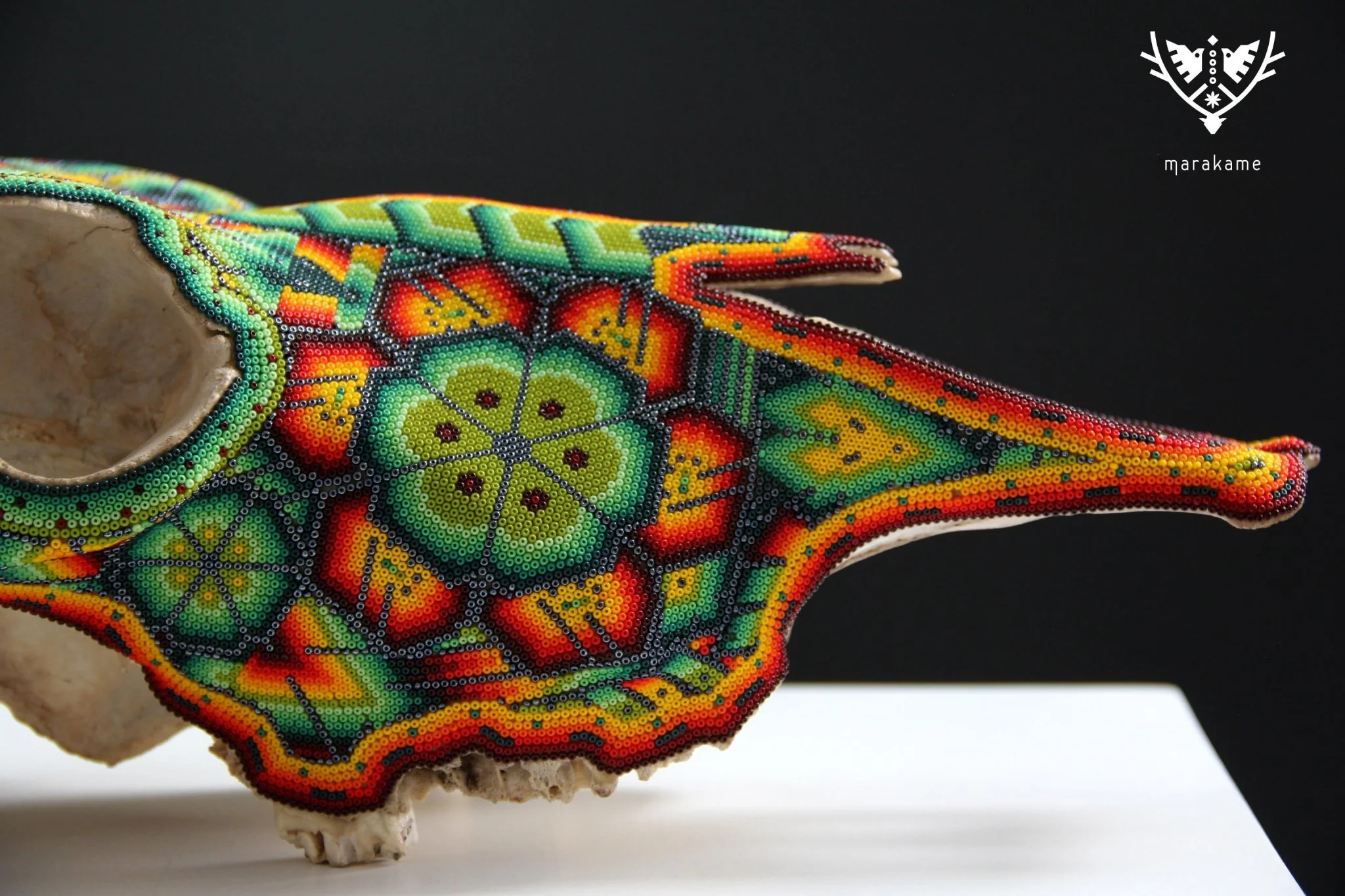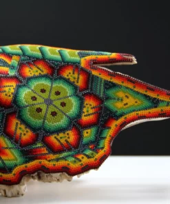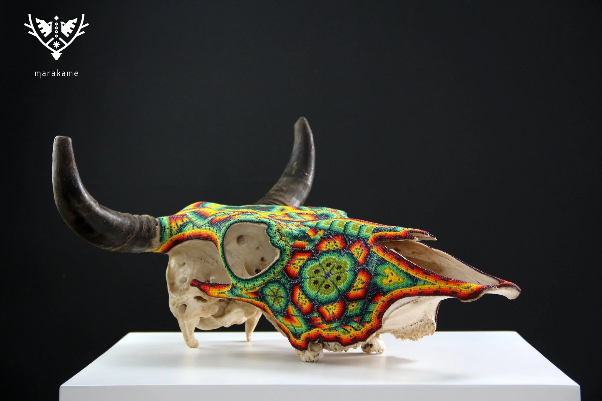 – El cráneo ha sido fumigado y barnizado para su exportación en caso de ser requerida.Piezas como los cráneos de ganado son producto de alguna celebración tradicional Wixárika -Huichol- y son posibles gracias al pegado de más de 33 mil chaquiras de cristal calibrado, una a una por las manos de los artistas Wixáritari. Cada pieza es única e irrepetible.