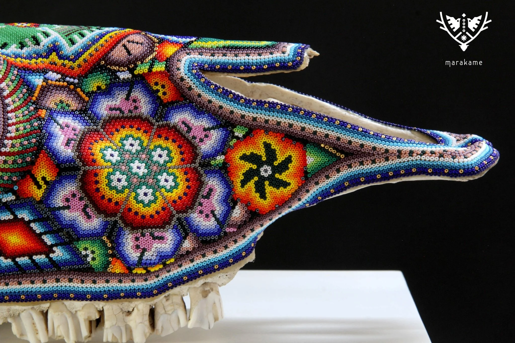 – El cráneo ha sido fumigado y barnizado para su exportación en caso de ser requerida.Piezas como los cráneos de ganado son producto de alguna celebración tradicional Wixárika -Huichol- y son posibles gracias al pegado de más de 33 mil chaquiras de cristal calibrado, una a una por las manos de los artistas Wixáritari. Cada pieza es única e irrepetible.