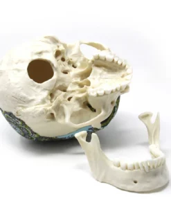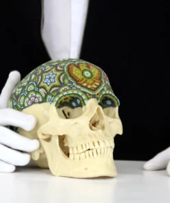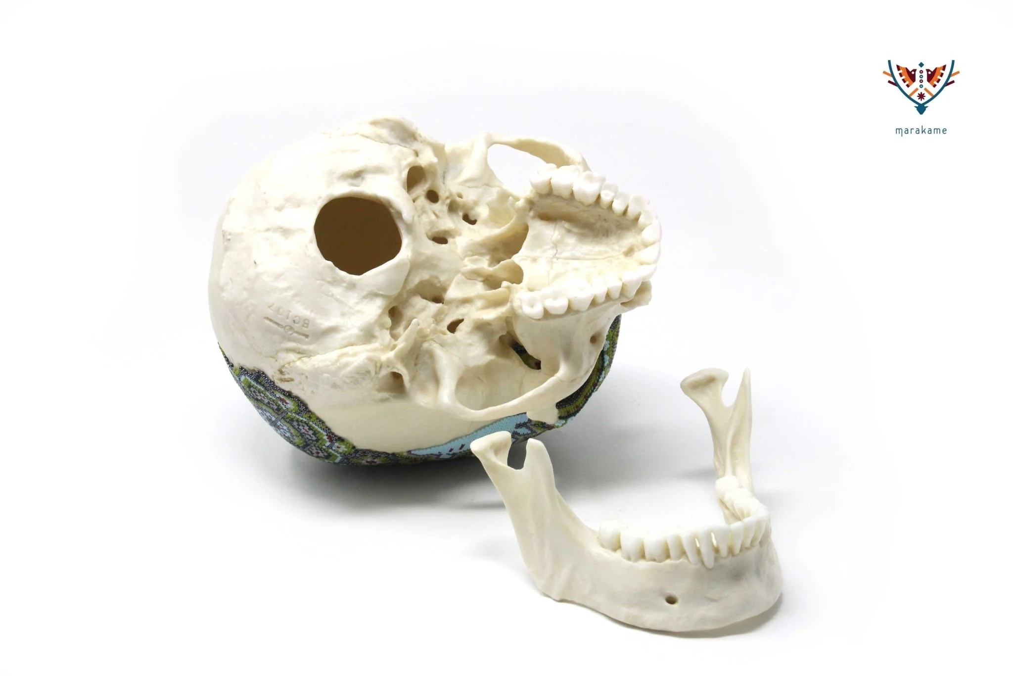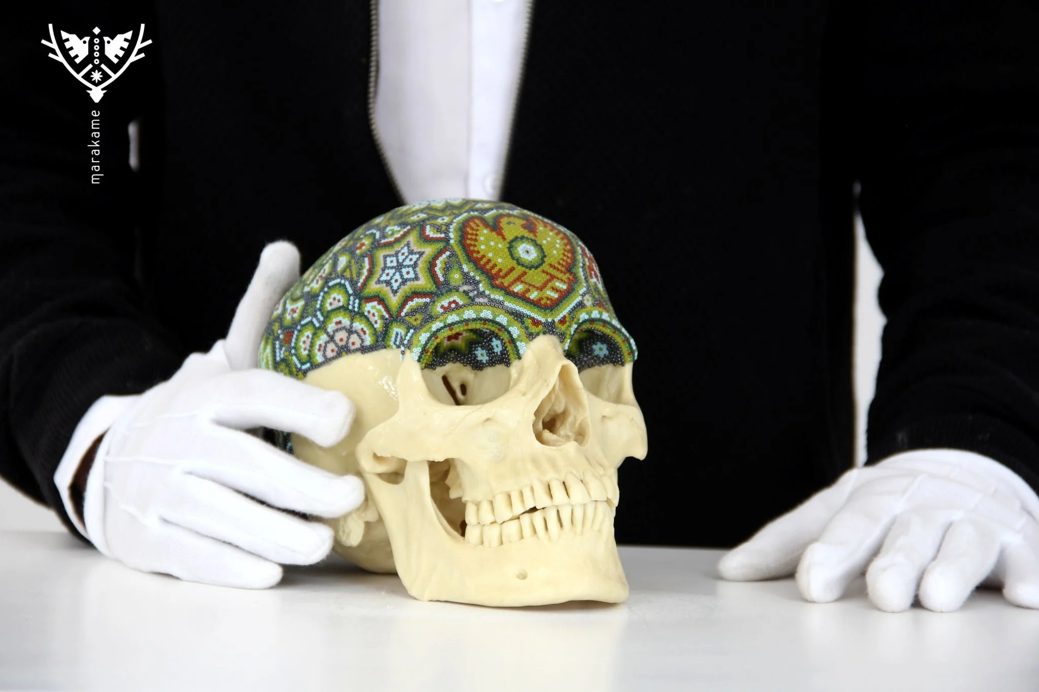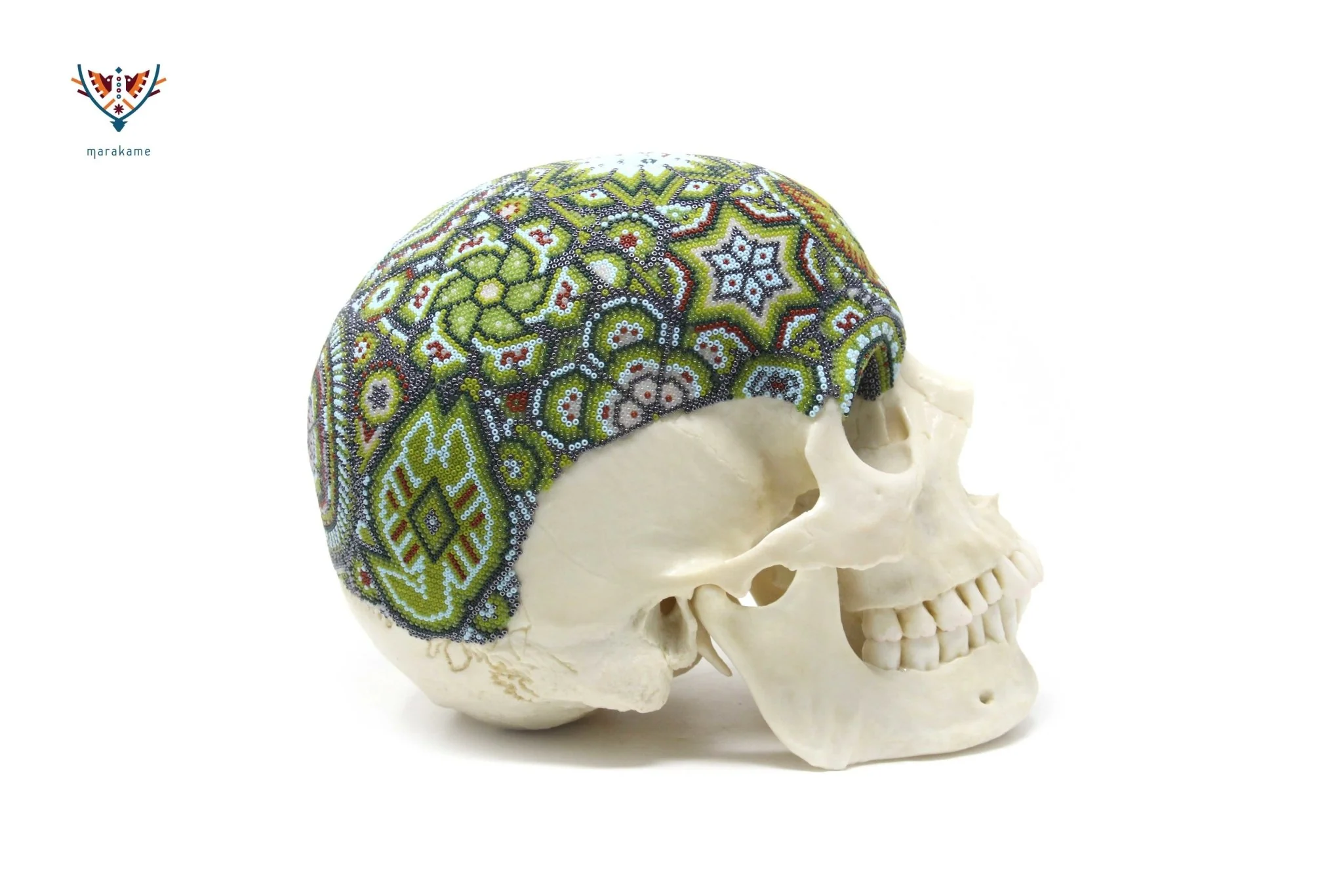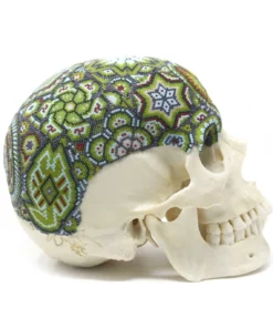 Este cráneo humano es un verdadero tesoro natural, decorado con chaquira solo en la parte superior, la chaquira se caracteriza por sus colores verdes naturales, que reflejan la conexión con la naturaleza y el equilibrio entre lo terrenal y lo celestial. En el centro de la chaquira se encuentra un relieve de una aguja, rodeada por venados azules durmiendo a los costados. Esta representación simbólica evoca la protección y la seguridad que se siente al tener un ángel vigilante cerca.