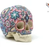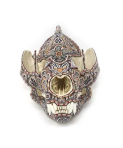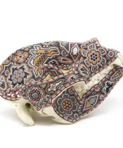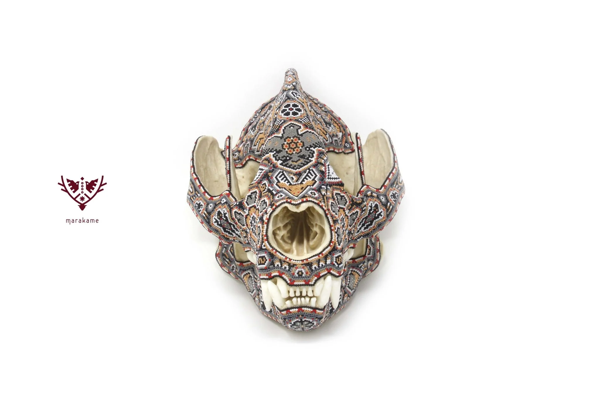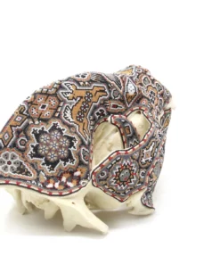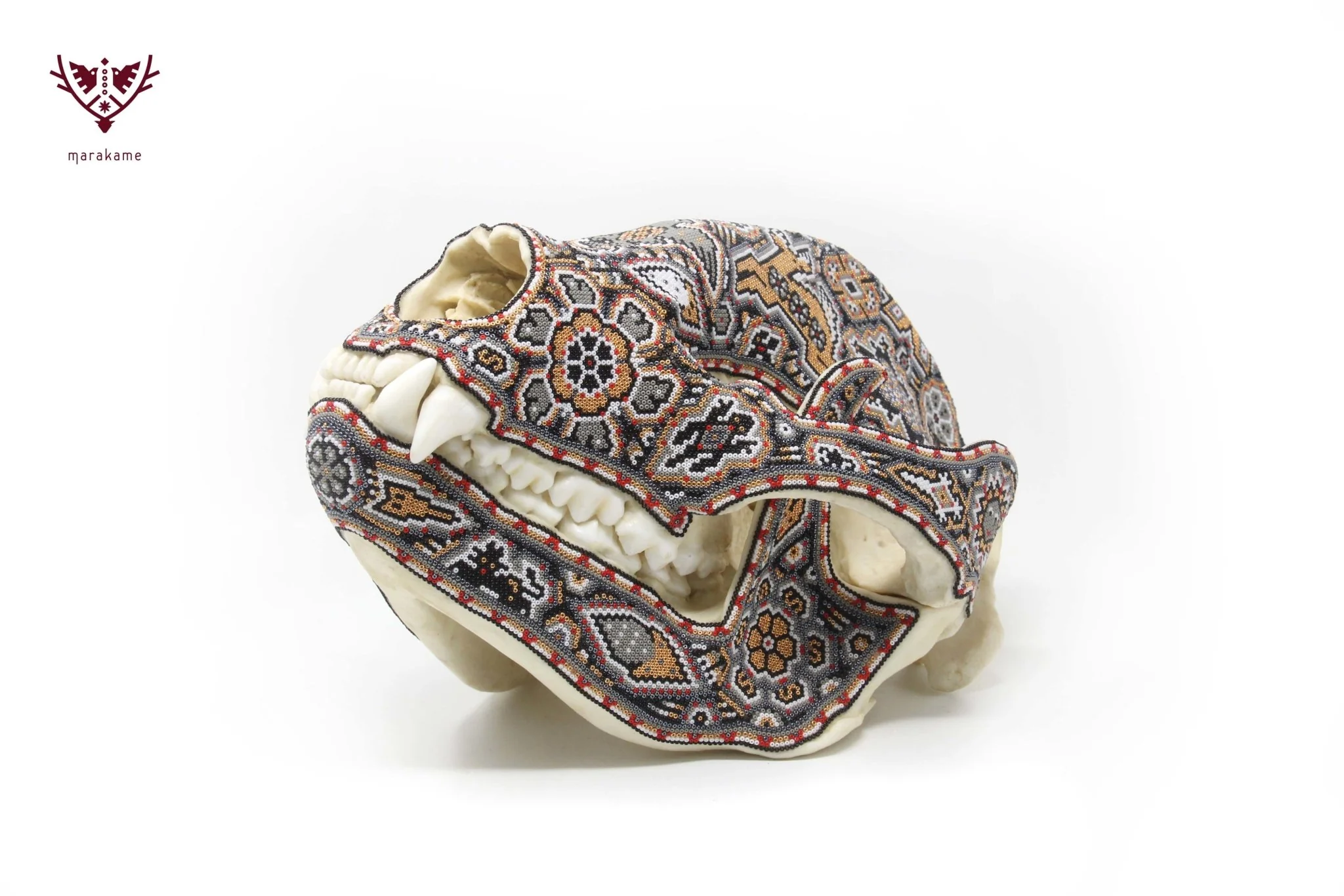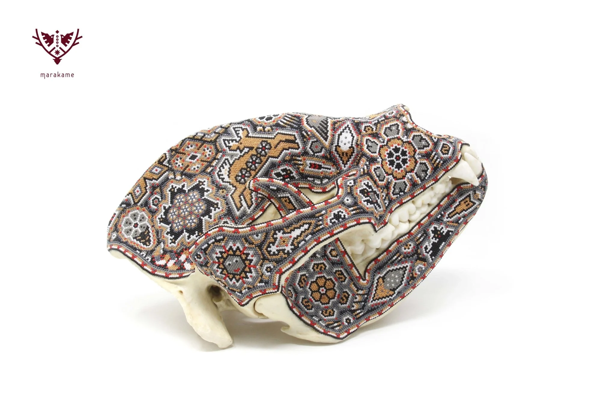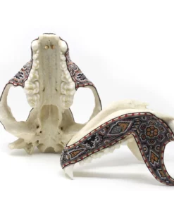Este cráneo de oso panda es un verdadero tesoro natural, decorado con chaquiras en colores tierra que reflejan la riqueza y la sabiduría de la cultura zapoteca. El cráneo está cubierto de una serie de patrones y diseños vistosos que invitan a la contemplación y evocan el espíritu ancestral y protector de este gran animal. En el centro del cráneo, se encuentra un relieve de una aguja, rodeada por venados y otros símbolos de la cultura zapoteca, creando un efecto visual impresionante que combina la fuerza y la belleza.